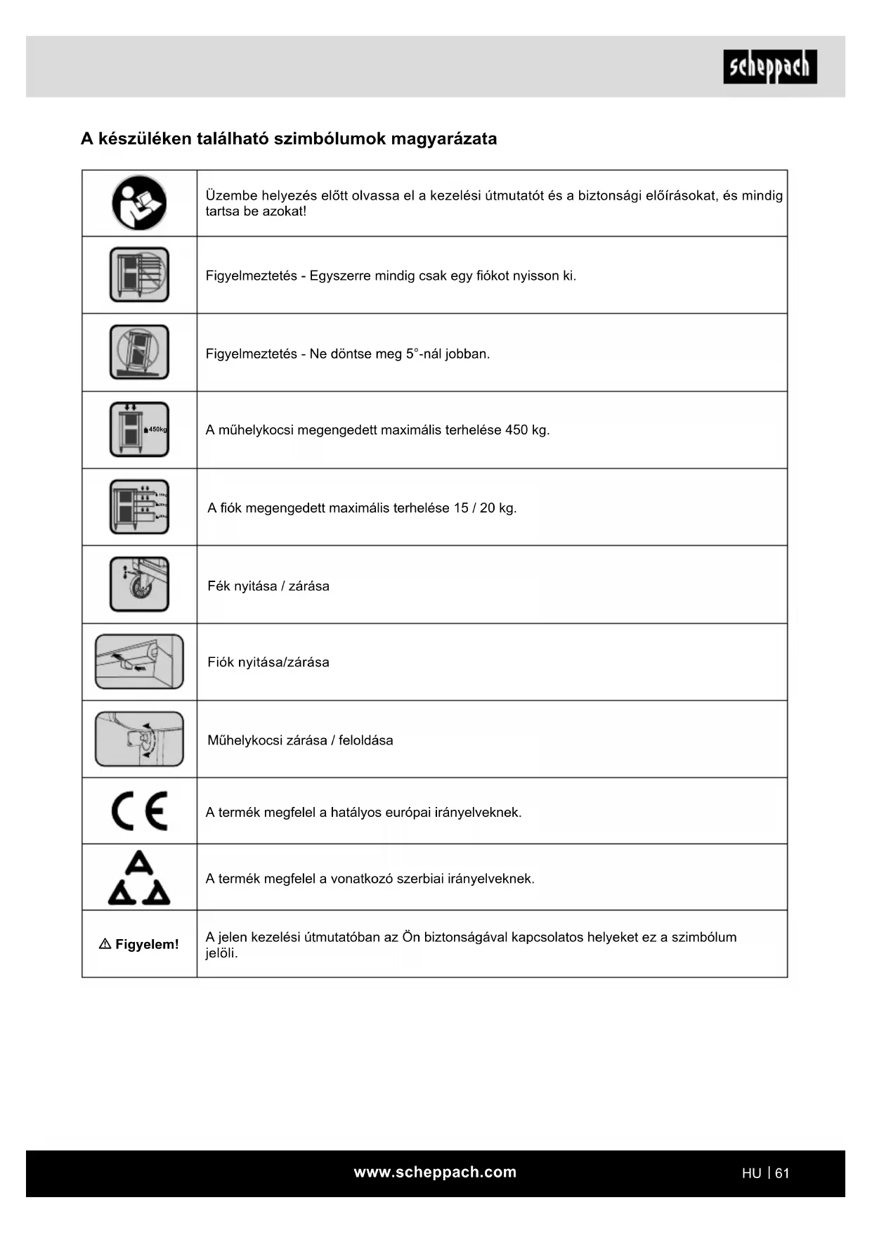 A készüléken található szimbólumok magyarázata Üzembe helyezés előtt olvassa el a kezelési útmutatót és a biztonsági előírásokat, és mindig tartsa be azokat! Figyelmeztetés - Egyszerre mindig csak egy ókot nyisson ki. Figyelmeztetés - Ne döntse meg 5°-nál jobban. 450kg A műhelykocsi megengedett maximális terhelése 450 kg. 15kg 20kg 20kg A ók megengedett maximális terhelése 15 / 20 kg. Fék nyitása / zárása Fiók nyitása/zárása Műhelykocsi zárása / feloldása A termék megfelel a hatályos európai irányelveknek. A termék megfelel a vonatkozó szerbiai irányelveknek. m Figyelem! A jelen kezelési útmutatóban az Ön biztonságával kapcsolatos helyeket ez a szimbólum jelöli.www.scheppach.com