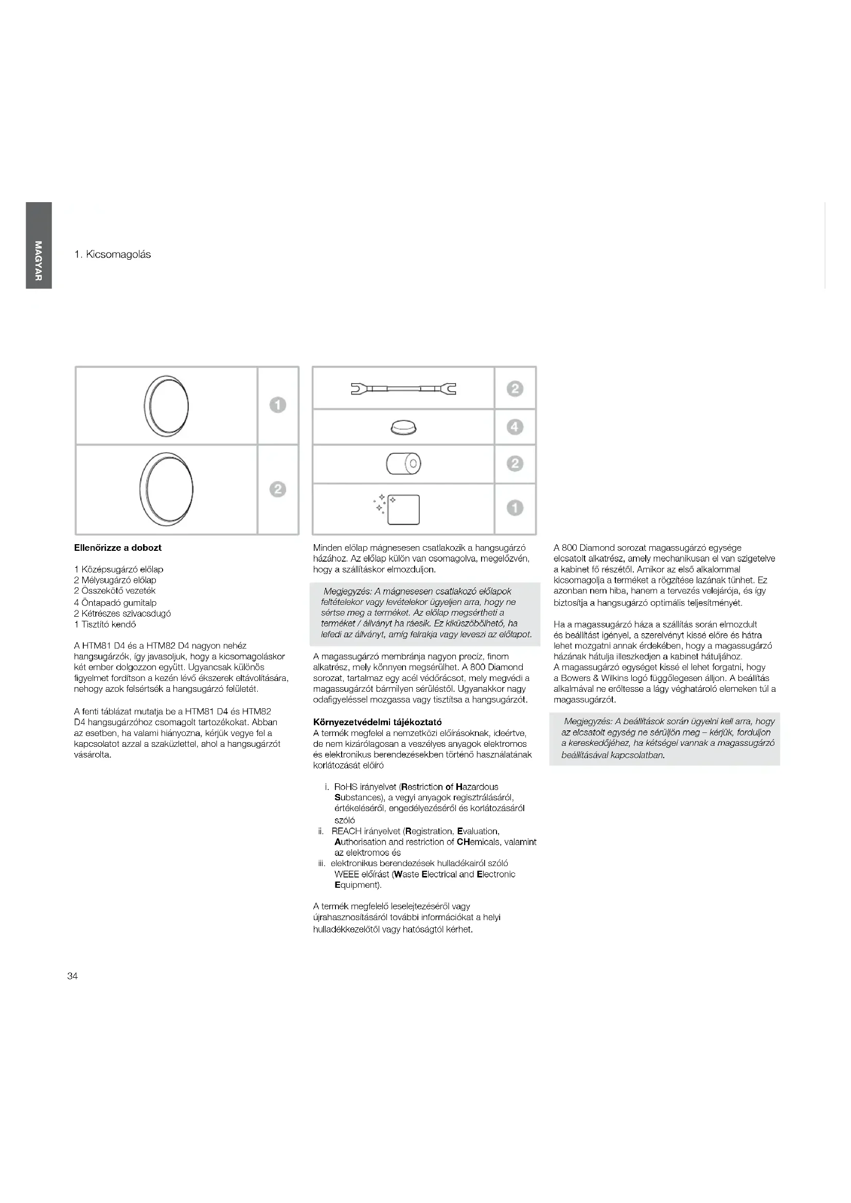 Ellenőrizze a dobozt 1 Középsugárzó előlap 2 Mélysugárzó előlap 2 Összekötő vezeték 4 Öntapadó gumitalp 2 Kétrészes szivacsdugó 1 Tisztító kendő A HTM81 D4 és a HTM82 D4 nagyon nehéz hangsugárzók, így javasoljuk, hogy a kicsomagoláskor két ember dolgozzon együtt. Ugyancsak különös gyelmet fordítson a kezén lévő ékszerek eltávolítására, nehogy azok felsértsék a hangsugárzó felületét. A fenti táblázat mutatja be a HTM81 D4 és HTM82 D4 hangsugárzóhoz csomagolt tartozékokat. Abban az esetben, ha valami hiányozna, kérjük vegye fel a kapcsolatot azzal a szaküzlettel, ahol a hangsugárzót vásárolta. Minden előlap mágnesesen csatlakozik a hangsugárzó házához. Az előlap külön van csomagolva, megelőzvén, hogy a szállításkor elmozduljon. Megjegyzés:Amágnesesencsatlakozóelőlapok feltételekorvagylevételekorügyeljenarra,hogyne sértsemegaterméket.Azelőlapmegsérthetia terméket/állványtharáesik.Ezkiküszöbölhető,ha lefediazállványt,amígfelrakjavagylevesziazelőlapot. A magassugárzó membránja nagyon precíz, nom alkatrész, mely könnyen megsérülhet. A 800 Diamond sorozat, tartalmaz egy acél védőrácsot, mely megvédi a magassugárzót bármilyen sérüléstől. Ugyanakkor nagy odagyeléssel mozgassa vagy tisztítsa a hangsugárzót. Környezetvédelmi tájékoztató A termék megfelel a nemzetközi előírásoknak, ideértve, de nem kizárólagosan a veszélyes anyagok elektromos és elektronikus berendezésekben történő használatának korlátozását előíró