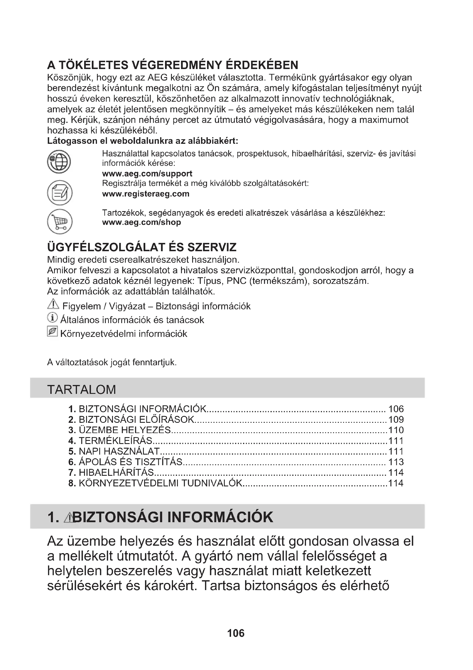 Mindig eredeti cserealkatrészeket használjon.Amikor felveszi a kapcsolatot a hivatalos szervizközponttal, gondoskodjon arról, hogy akövetkező adatok kéznél legyenek: Típus, PNC (termékszám), sorozatszám.Az információk az adattáblán találhatók. Figyelem / Vigyázat – Biztonsági információk Általános információk és tanácsok Környezetvédelmi információkA változtatások jogát fenntartjuk. TARTALOM