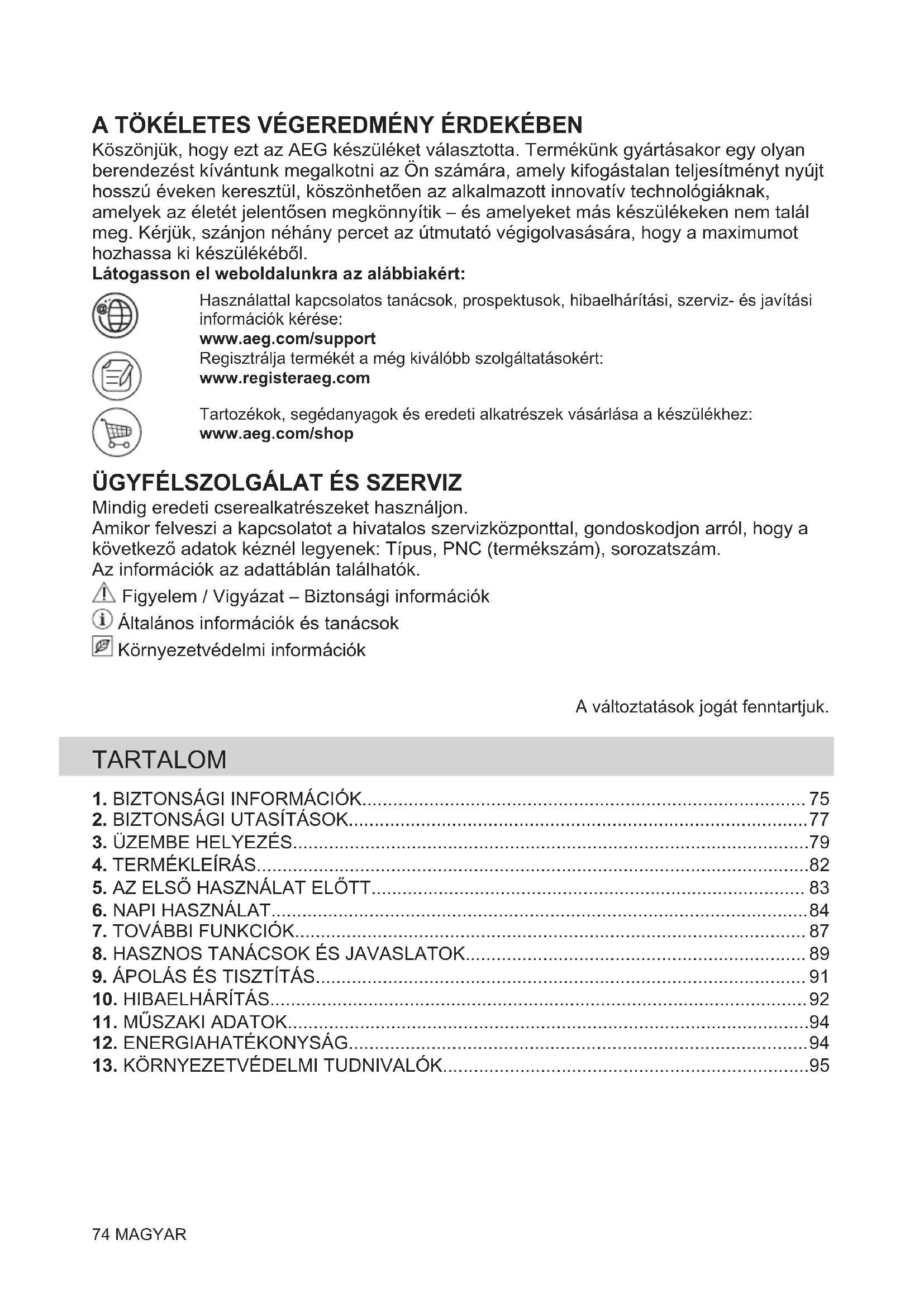 - Utilisez la chaleur résiduelle pour garder les aliments au chaud ou pour les faire fondre. 72 FRANÇAIS13. EN MATIÈRE DE PROTECTION DE L'ENVIRONNEMENT Recyclez les matériaux portant le symbole . Déposez les emballages dans les conteneurs prévus à cet effet. Contribuez à la protection de l'environnement et à votre sécurité, recyclez vos produits électriques et électroniques. Ne jetez pas les appareils portant le symbole avec les ordures ménagères. Emmenez un tel produit dans votre centre local de recyclage ou contactez vos services municipaux. Concerne la France uniquement : FRANÇAIS 73A TÖKÉLETES VÉGEREDMÉNY ÉRDEKÉBEN Köszönjük, hogy ezt az AEG készüléket választotta. Termékünk gyártásakor egy olyan berendezést kívántunk megalkotni az Ön számára, amely kifogástalan teljesítményt nyújt hosszú éveken keresztül, köszönhetően az alkalmazott innovatív technológiáknak, amelyek az életét jelentősen megkönnyítik – és amelyeket más készülékeken nem talál meg. Kérjük, szánjon néhány percet az útmutató végigolvasására, hogy a maximumot hozhassa ki készülékéből. Látogasson el weboldalunkra az alábbiakért: Használattal kapcsolatos tanácsok, prospektusok, hibaelhárítási, szerviz- és javítási információk kérése: www.aeg.com/support Regisztrálja termékét a még kiválóbb szolgáltatásokért: www.registeraeg.com Tartozékok, segédanyagok és eredeti alkatrészek vásárlása a készülékhez: www.aeg.com/shop