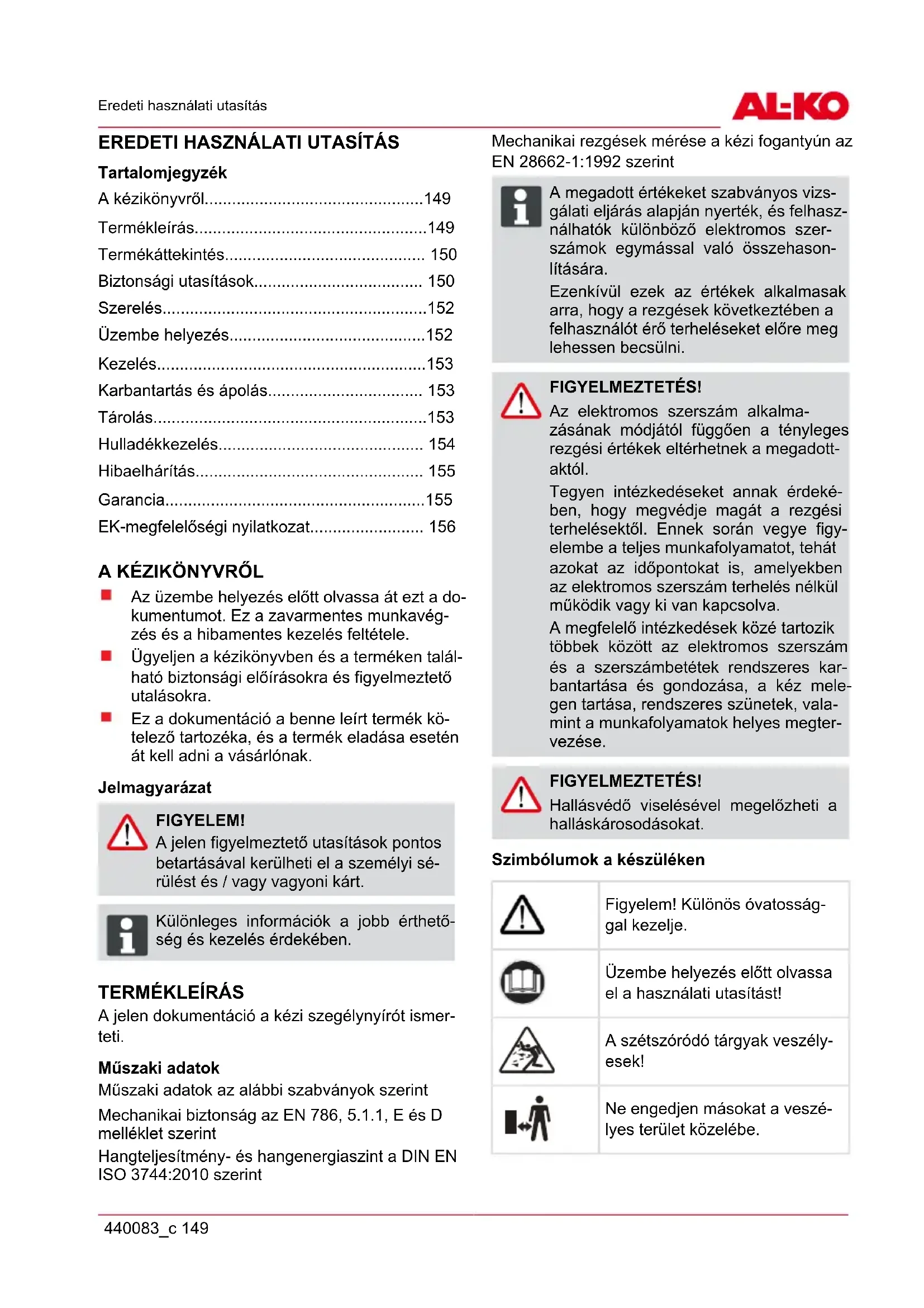 A jelen dokumentáció a kézi szegélynyírót ismer- teti. Műszaki adatok Műszaki adatok az alábbi szabványok szerint Mechanikai biztonság az EN 786, 5.1.1, E és D melléklet szerint Hangteljesítmény- és hangenergiaszint a DIN EN ISO 3744:2010 szerint Mechanikai rezgések mérése a kézi fogantyún az EN 28662-1:1992 szerint ADVICE A megadott értékeket szabványos vizs- gálati eljárás alapján nyerték, és felhasz- nálhatók különböző elektromos szer- számok egymással való összehason- lítására. Ezenkívül ezek az értékek alkalmasak arra, hogy a rezgések következtében a felhasználót érő terheléseket előre meg lehessen becsülni. FIGYELMEZTETÉS! Az elektromos szerszám alkalma- zásának módjától függően a tényleges rezgési értékek eltérhetnek a megadott- aktól. Tegyen intézkedéseket annak érdeké- ben, hogy megvédje magát a rezgési terhelésektől. Ennek során vegye figy- elembe a teljes munkafolyamatot, tehát azokat az időpontokat is, amelyekben az elektromos szerszám terhelés nélkül működik vagy ki van kapcsolva. A megfelelő intézkedések közé tartozik többek között az elektromos szerszám és a szerszámbetétek rendszeres kar- bantartása és gondozása, a kéz mele- gen tartása, rendszeres szünetek, vala- mint a munkafolyamatok helyes megter- vezése. FIGYELMEZTETÉS! Hallásvédő viselésével megelőzheti a halláskárosodásokat. Szimbólumok a készüléken Figyelem! Különös óvatosság- gal kezelje. Üzembe helyezés előtt olvassa el a használati utasítást! A szétszóródó tárgyak veszély- esek! Ne engedjen másokat a veszé- lyes terület közelébe.hu Termékleírás 150 GTE 350 / 450 / 550 A készülék és egy harmadik, külső személy között legalább 15 m távolság legyen. A készüléket ne tegye ki ned- vességnek vagy nyirkosságnak. Viseljen védőszemüveget, védősisakot és fülvédőt. Azonnal válassza le a hálózat- ról a berendezést, ha megsérült vagy elszakadt az elektromos kábel! Állítható teleszkópos kar A szegélynyíróhoz állítható teleszkópos kar tarto- zik. Ennek segítségével a készülék beállítható az egyéni testmagassághoz, és a motor elforgat- ható. Elforgatható és dönthető vágófej A GTE 450-hez és 550-hez elforgatható és dönt- hető vágófej tartozik. Tipp-automatika A damilfejhez tipp-automatika (8-4) tartozik, ami által a vágódamil működő motor mellett meghoss- zabbítható. Biztonsági és védőberendezések Gyermekzár A motorvédő kapcsolón lévő furat (5 mm) egy la- kathoz* szolgál. A lakat megakadályozza a kés- zülék akaratlan bekapcsolását.
