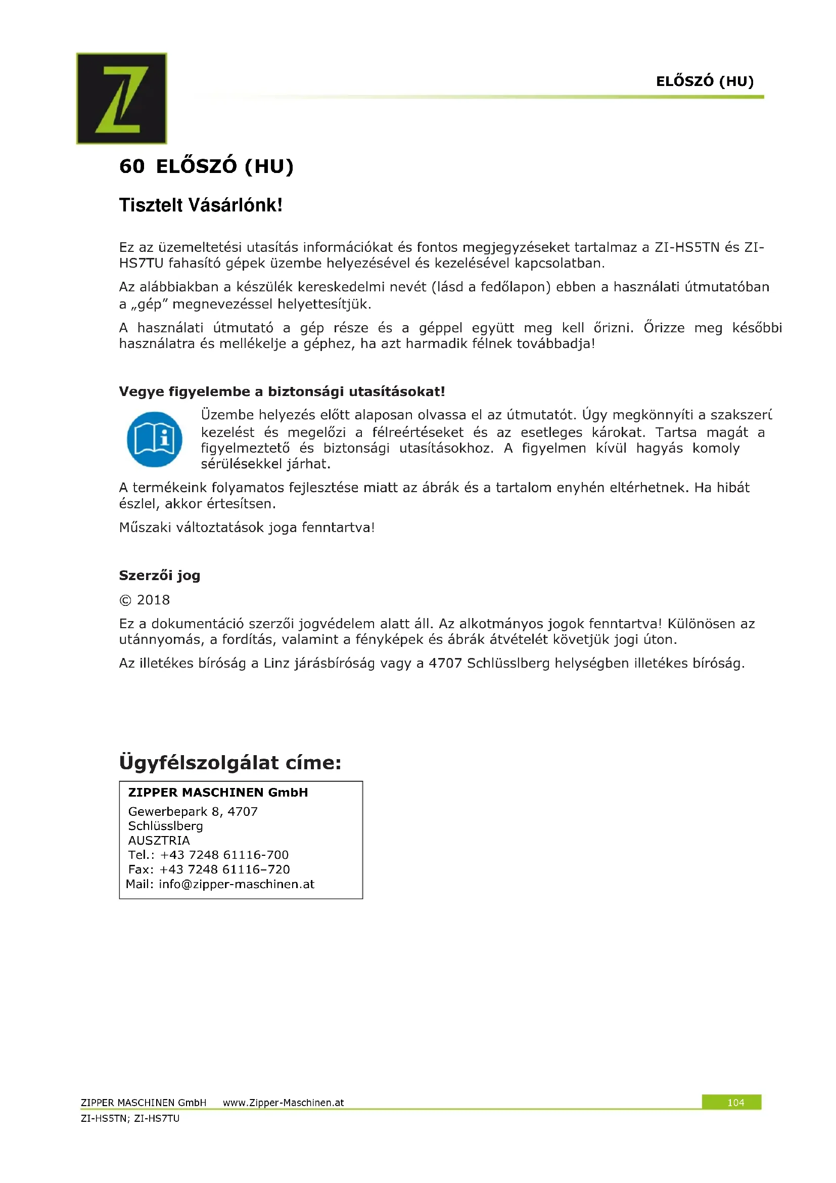 Nem rendeltetesszeru hasznalat, ill. a jelen utmutatoban foglalt leirasok es utmutatok figyelmen kivul hagyasa eseten a Zipper GmbH-val szemben tamasztott osszes garancialis koveteles es karteritesi igeny ervenytelenné valik.