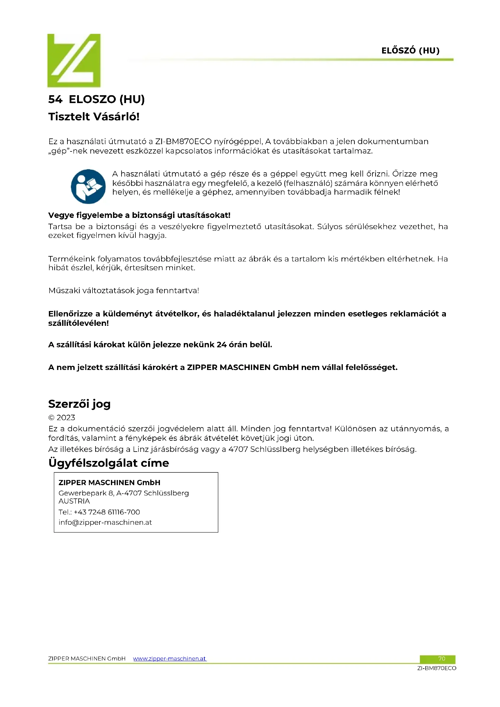 ZIPPER MASCHINEN GmbH Gewerbepark 8, A-4707 Schlüsslberg AUSTRIA Tel.: +43 7248 61116-700 info@zipper-maschinen.atBIZTONSÁG ZIPPER MASCHINEN GmbH www.zipper-maschinen.at 71 ZI-BM870ECO 55 BIZTONSAG Ez a rész információkat és fontos tudnivalókat tartalmaz a gép üzembe helyezésével és kezelésével kapcsolatban. A biztonsága érdekében, üzembe helyezés előtt olvassa el gondosan a jelen használati útmutatót. Ez lehetővé teszi a gép biztonságos kezelését, és ezzel elkerülheti a félreértéseket és a személyi és anyagi károkat. Vegye figyelembe ezenkívül a gépen elhelyezett szimbólumokat és piktogramokat, valamint a biztonsági és veszélyességi tudnivalókat!