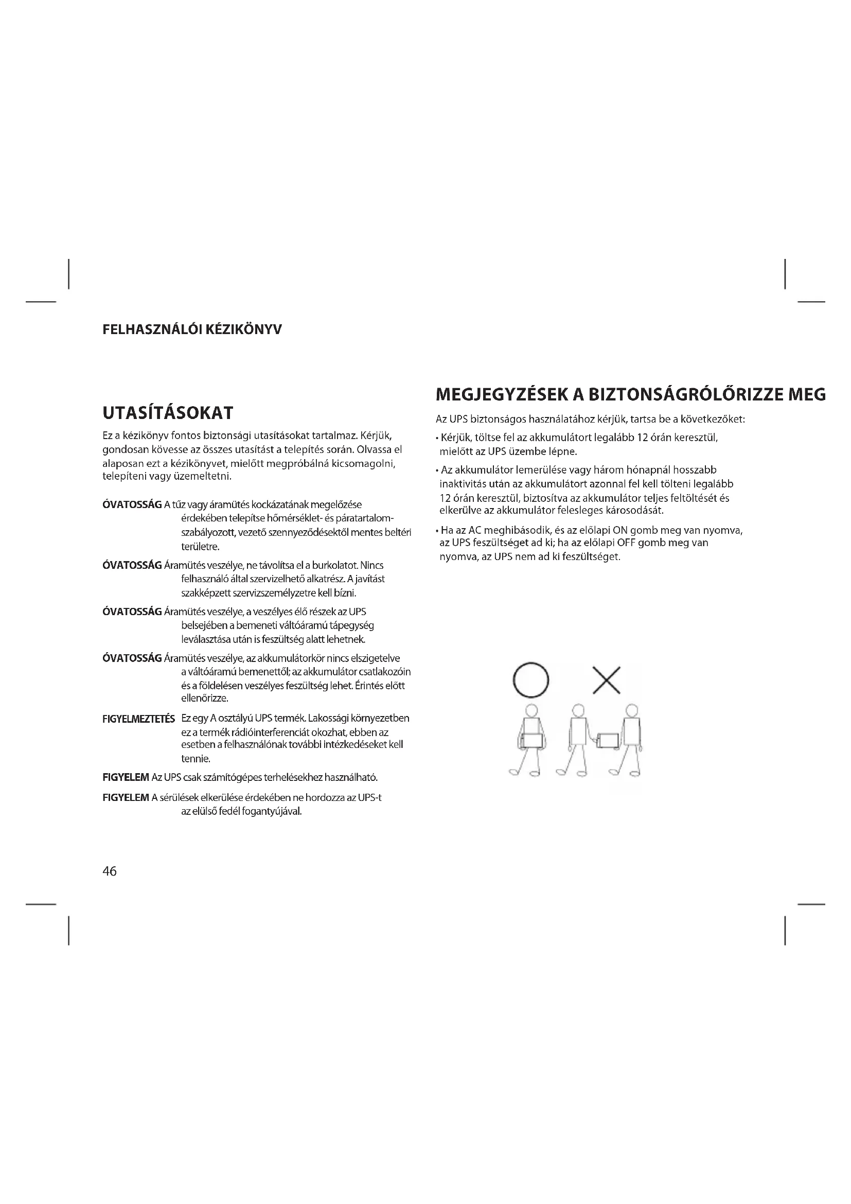 - Ha az AC meghibásodik, és az előlapi ON gomb meg van nyomva, az UPS feszültséget ad ki; ha az előlapi OFF gomb meg van nyomva, az UPS nem ad ki feszültséget. Ez a kézikönyv fontos biztonsági utasításokat tartalmaz. Kérjük, gondosan kövesse az összes utasítást a telepítés során. Olvassa el alaposan ezt a kézikönyvet, mielőtt megpróbálná kicsomagolni, telepíteni vagy üzemeltetni. ÓVATOSSÁG A tűz vagy áramütés kockázatának megelőzése érdekében telepítse hőmérséklet- és páratartalom- szabályozott, vezető szennyeződésektől mentes beltéri területre. ÓVATOSSÁG Áramütés veszélye, ne távolítsa el a burkolatot. Nincs felhasználó által szervizelhető alkatrész. A javítást szakképzett szervizszemélyzetre kell bízni. ÓVATOSSÁG Áramütés veszélye, a veszélyes élő részek az UPS belsejében a bemeneti váltóáramú tápegység leválasztása után is feszültség alatt lehetnek. ÓVATOSSÁG Áramütés veszélye, az akkumulátorkör nincs elszigetelve a váltóáramú bemenettől; az akkumulátor csatlakozóin és a földelésen veszélyes feszültség lehet. Érintés előtt ellenőrizze. FIGYELMEZTETÉS Ez egy A osztályú UPS termék. Lakossági környezetben ez a termék rádióinterferenciát okozhat, ebben az esetben a felhasználónak további intézkedéseket kell tennie. FIGYELEM Az UPS csak számítógépes terhelésekhez használható. FIGYELEM A sérülések elkerülése érdekében ne hordozza az UPS-t az elülső fedél fogantyújával.47 MAGYAR