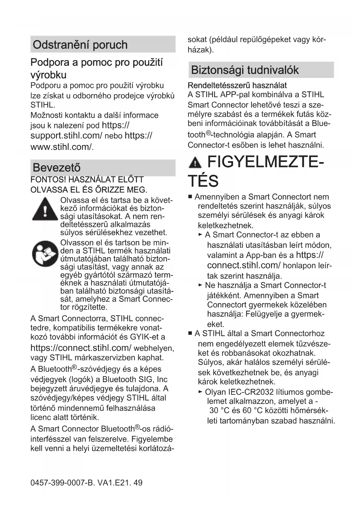 OLVASSA EL ÉS ŐRIZZE MEG. Olvassa el és tartsa be a követ‐ kező információkat és bizton‐ sági utasításokat. A nem ren‐ deltetésszerű alkalmazás súlyos sérülésekhez vezethet. Olvasson el és tartson be min‐ den a STIHL termék használati útmutatójában található bizton‐ sági utasítást, vagy annak az egyéb gyártótól származó term‐ éknek a használati útmutatójá‐ ban található biztonsági utasítá‐ sát, amelyhez a Smart Connec‐ tor rögzítette. A Smart Connectorra, STIHL connec‐ tedre, kompatibilis termékekre vonat‐ kozó további információt és GYIK-et a https://connect.stihl.com/ webhelyen, vagy STIHL márkaszervizben kaphat. A Bluetooth