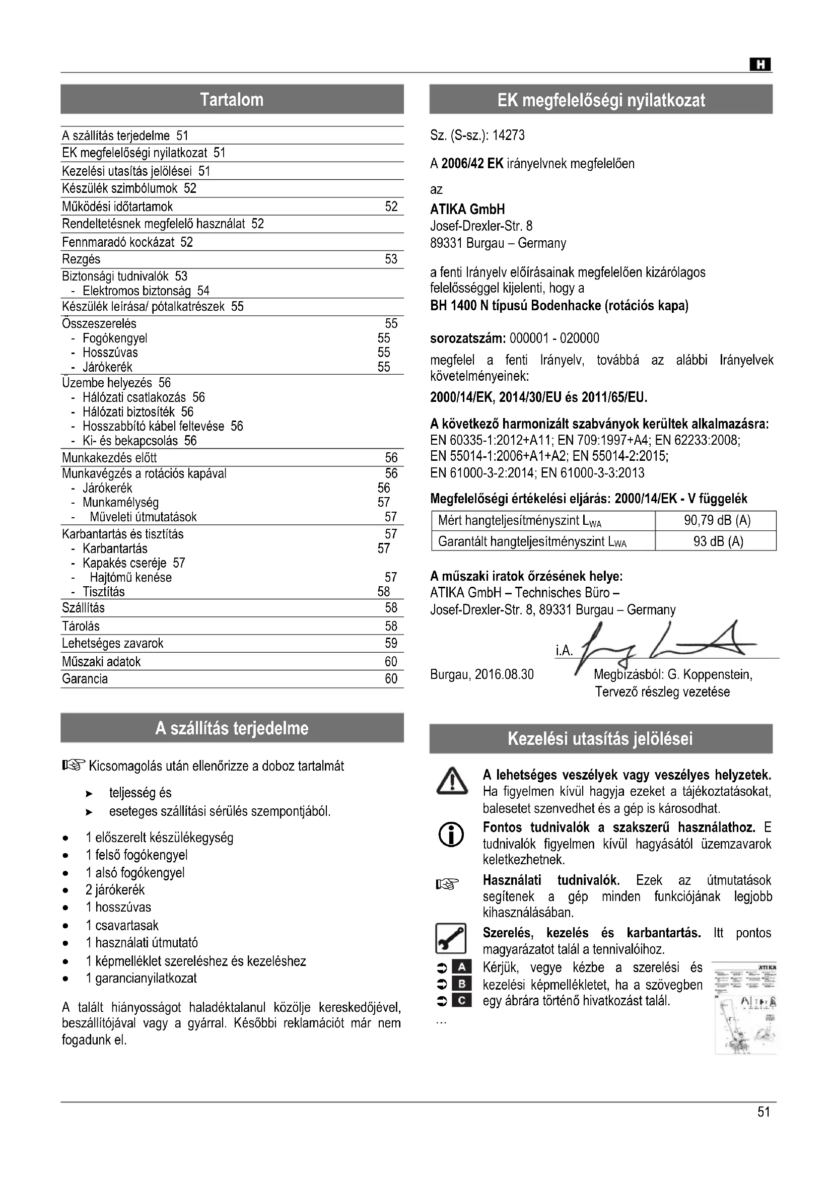 93 dB (A) A műszaki iratok őrzésének helye: ATIKA GmbH – Technisches Büro – Josef-Drexler-Str. 8, 89331 Burgau – Germany i.A. Burgau, 2016.08.30 Megbízásból: G. Koppenstein, Tervező részleg vezetése
