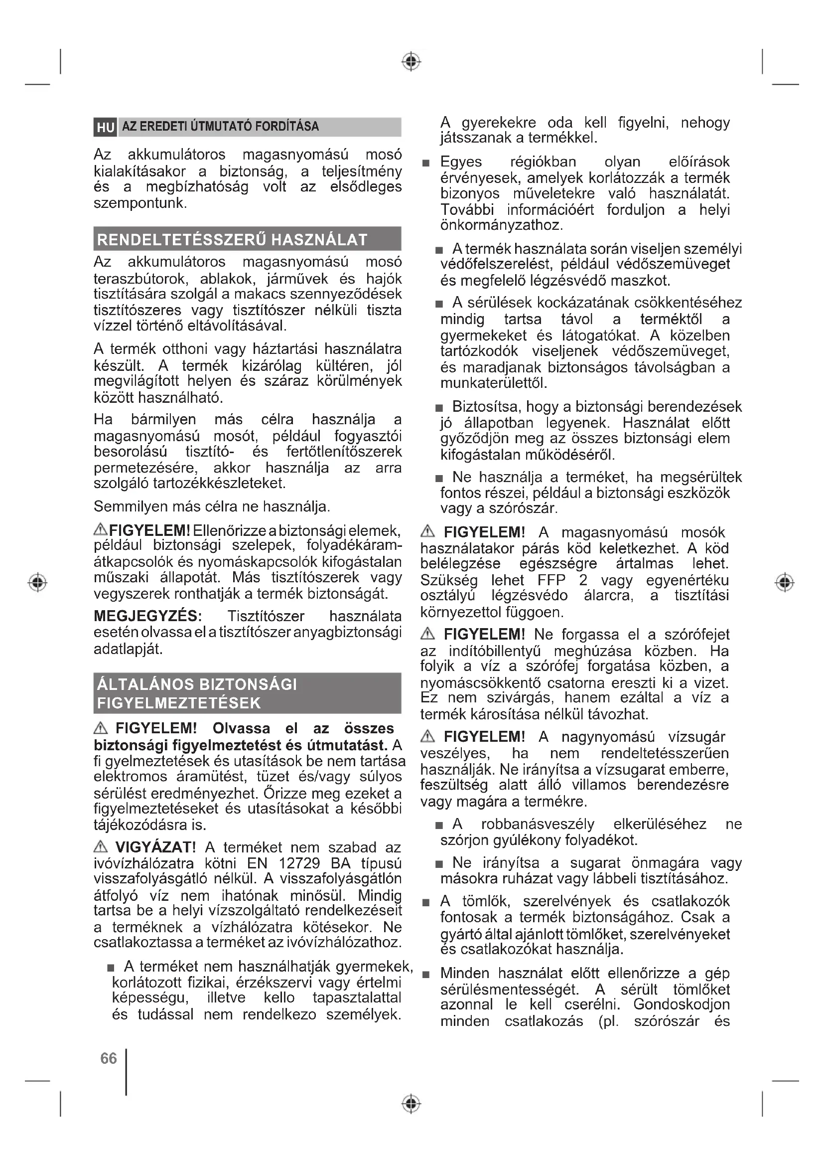 FIGYELMEZTETÉSEK FIGYELEM! Olvassa el az összes biztonsági figyelmeztetést és útmutatást. A fi gyelmeztetések és utasítások be nem tartása elektromos áramütést, tüzet és/vagy súlyos sérülést eredményezhet. Őrizze meg ezeket a fi gyelmeztetéseket és utasításokat a későbbi tájékozódásra is. VIGYÁZAT! A terméket nem szabad az ivóvízhálózatra kötni EN 12729 BA típusú visszafolyásgátló nélkül. A visszafolyásgátlón átfolyó víz nem ihatónak minősül. Mindig tartsa be a helyi vízszolgáltató rendelkezéseit a terméknek a vízhálózatra kötésekor. Ne csatlakoztassa a terméket az ivóvízhálózathoz. ■ A terméket nem használhatják gyermekek, korlátozott fizikai, érzékszervi vagy értelmi képességu, illetve kello tapasztalattal és tudással nem rendelkezo személyek. A gyerekekre oda kell figyelni, nehogy játsszanak a termékkel. ■ Egyes régiókban olyan előírások érvényesek, amelyek korlátozzák a termék bizonyos műveletekre való használatát. További információért forduljon a helyi önkormányzathoz. ■ A termék használata során viseljen személyi védőfelszerelést, például védőszemüveget és megfelelő légzésvédő maszkot. ■ A sérülések kockázatának csökkentéséhez mindig tartsa távol a terméktől a gyermekeket és látogatókat. A közelben tartózkodók viseljenek védőszemüveget, és maradjanak biztonságos távolságban a munkaterülettől. ■ Biztosítsa, hogy a biztonsági berendezések jó állapotban legyenek. Használat előtt győződjön meg az összes biztonsági elem kifogástalan működéséről. ■ Ne használja a terméket, ha megsérültek fontos részei, például a biztonsági eszközök vagy a szórószár. FIGYELEM! A magasnyomású mosók használatakor párás köd keletkezhet. A köd belélegzése egészségre ártalmas lehet. Szükség lehet FFP 2 vagy egyenértéku osztályú légzésvédo álarcra, a tisztítási környezettol függoen. FIGYELEM! Ne forgassa el a szórófejet az indítóbillentyű meghúzása közben. Ha folyik a víz a szórófej forgatása közben, a nyomáscsökkentő csatorna ereszti ki a vizet. Ez nem szivárgás, hanem ezáltal a víz a termék károsítása nélkül távozhat. FIGYELEM! A nagynyomású vízsugár veszélyes, ha nem rendeltetésszerűen használják. Ne irányítsa a vízsugarat emberre, feszültség alatt álló villamos berendezésre vagy magára a termékre. ■ A robbanásveszély elkerüléséhez ne szórjon gyúlékony folyadékot. ■ Ne irányítsa a sugarat önmagára vagy másokra ruházat vagy lábbeli tisztításához. ■ A tömlők, szerelvények és csatlakozók fontosak a termék biztonságához. Csak a gyártó által ajánlott tömlőket, szerelvényeket és csatlakozókat használja. ■ Minden használat előtt ellenőrizze a gép sérülésmentességét. A sérült tömlőket azonnal le kell cserélni. Gondoskodjon minden csatlakozás (pl. szórószár és 66fúvóka) biztonságos állapotáról. A tömlőt úgy tekerje le, hogy ne csavarodjon meg és ne képezzen hurkot. ■ A tisztítás megkezdése előtt zárja be az ajtókat és ablakokat. Takarítsa le a tisztítandó területről a szemetet, játékokat, szabadtéri bútort és más tárgyakat, amelyek elrepülve veszélyforrássá válhatnak. ■ Ne használja a terméket 0 °C alatti hőmérsékleten. ■ Ne használjon a termékben savat, lúgot, oldószert, gyúlékony anyagot, hipót vagy ipari oldatokat. Ezek károsíthatják a kezelő egészségét és tönkretehetik a terméket. ■ Két kézzel, szilárdan tartsa a kart. A kioldóbillentyű meghúzásakor a kar visszarúg – számítson erre. Ha ezt elmulasztja, elvesztheti a termék feletti uralmát, megsérülhet és másokat is veszélybe sodorhat. ■ Vigyázzon, nehogy megcsússzon és elessen. ■ Mindig tartson megfelelő testtartást és egyensúlyt. Ne hajoljon ki túlságosan. A túlzott kinyúlás egyensúlyvesztést és súlyos sérülést eredményezhet. ■ Soha ne hagyja felügyelet nélkül működni a gépet. Kapcsolja ki a terméket. Ne hagyja magára a terméket, amíg az teljesen le nem áll. A bekapcsolt terméket gyermekek által nem elérheto helyen tartsa. ■ Legyen tisztában a termék kezeloszerveivel és a helyes használatával. Tanulja meg, hogyan kell a terméket leállítani és gyorsan nyomásmentesíteni. ■ Legyen éber és gyakorolja az irányítást. Figyeljen arra, amit csinál, és használja az összes érzékszervét. ■ Ne használja a terméket, ha fáradt, beteg vagy alkohol, gyógyszerek, illetve más tudatmódosítók hatása alatt áll. A termékek használata közben már egyetlen figyelmetlen pillanat is súlyos személyi sérüléshez vezethet. ■ Ne használja a terméket, ha a kapcsoló nem kapcsolja be vagy ki a terméket. A kapcsolóval nem vezérelhető termék veszélyes, ezért azt meg kell javítani. ■ Tisztítandó járművektől tartson legalább 30 cm távolságot. A nagynyomású sugár megsértheti vagy átlyukaszthatja járművek gumiabroncsát és szelepét. ■ Ne használja a terméket, ha leejtették, ha látható sérülések vannak rajta vagy szivárog. ■ Hosszabb használat sérülést okozhat. Ha a terméket hosszabb ideig használja, ügyeljen arra, hogy rendszeresen tartson szünetet.