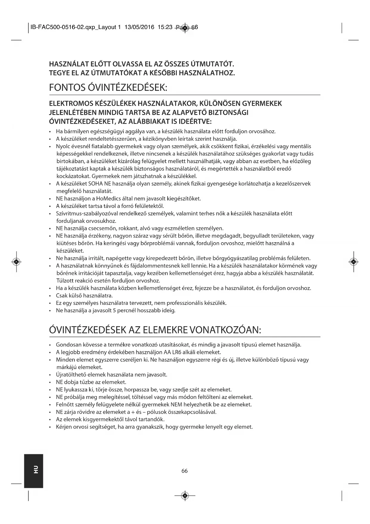 - Kérjen orvosi segítséget, ha arra gyanakszik, hogy gyermeke lenyelt egy elemet. IB-FAC500-0516-02.qxp_Layout 1 13/05/2016 15:23 Page 6667