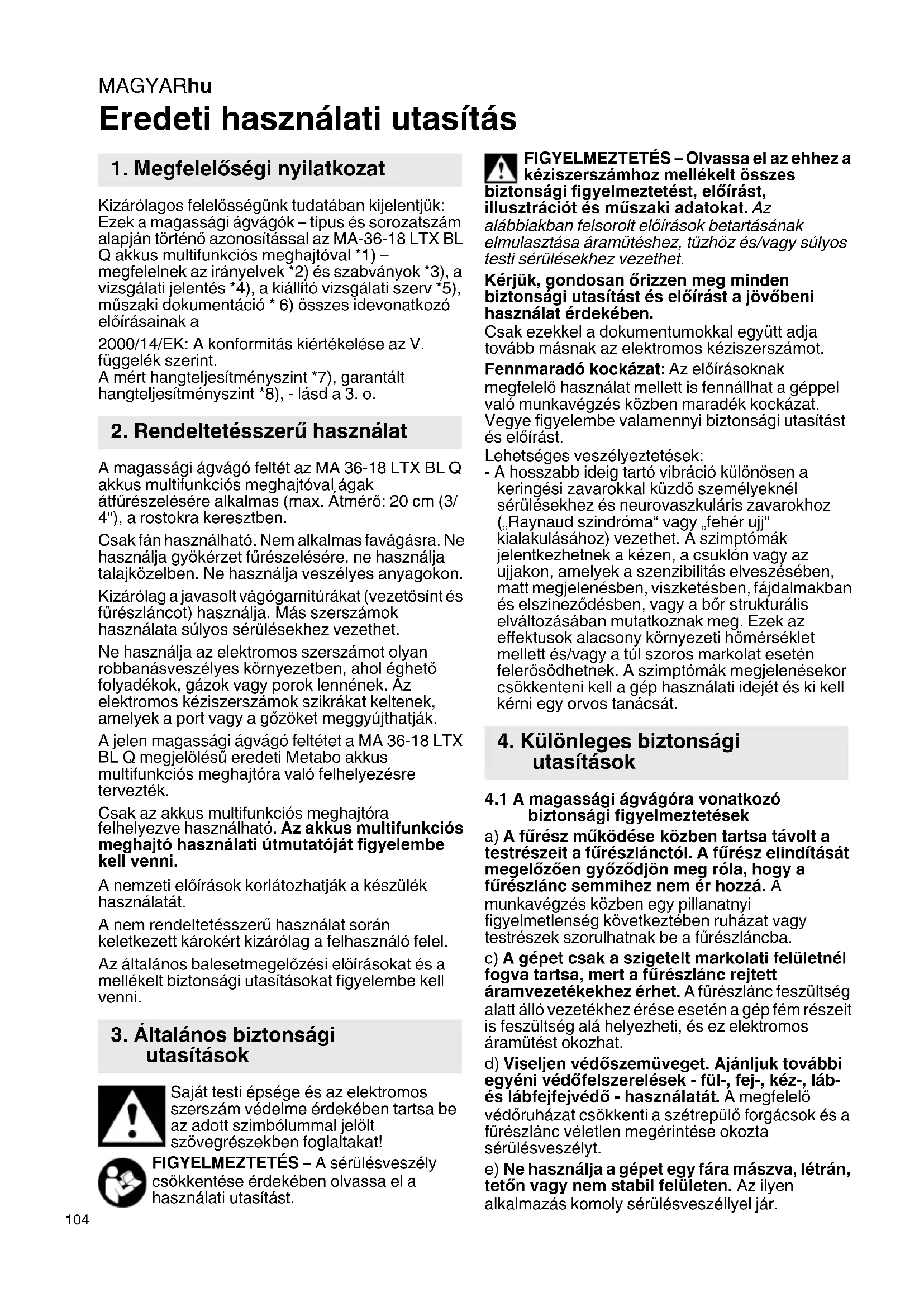 Eredeti használati utasítás Kizárólagos felelősségünk tudatában kijelentjük: Ezek a magassági ágvágók – típus és sorozatszám alapján történő azonosítással az MA-36-18 LTX BL Q akkus multifunkciós meghajtóval *1) – megfelelnek az irányelvek *2) és szabványok *3), a vizsgálati jelentés *4), a kiállító vizsgálati szerv *5), műszaki dokumentáció * 6) összes idevonatkozó előírásainak a 2000/14/EK: A konformitás kiértékelése az V. függelék szerint. A mért hangteljesítményszint *7), garantált hangteljesítményszint *8), - lásd a 3. o. A magassági ágvágó feltét az MA 36-18 LTX BL Q akkus multifunkciós meghajtóval ágak átfűrészelésére alkalmas (max. Átmérő: 20 cm (3/ 4“), a rostokra keresztben. Csak fán használható. Nem alkalmas favágásra. Ne használja gyökérzet fűrészelésére, ne használja talajközelben. Ne használja veszélyes anyagokon. Kizárólag a javasolt vágógarnitúrákat (vezetősínt és fűrészláncot) használja. Más szerszámok használata súlyos sérülésekhez vezethet. Ne használja az elektromos szerszámot olyan robbanásveszélyes környezetben, ahol éghető folyadékok, gázok vagy porok lennének. Az elektromos kéziszerszámok szikrákat keltenek, amelyek a port vagy a gőzöket meggyújthatják. A jelen magassági ágvágó feltétet a MA 36-18 LTX BL Q megjelölésű eredeti Metabo akkus multifunkciós meghajtóra való felhelyezésre tervezték. Csak az akkus multifunkciós meghajtóra felhelyezve használható. Az akkus multifunkciós meghajtó használati útmutatóját figyelembe kell venni. A nemzeti előírások korlátozhatják a készülék használatát. A nem rendeltetésszerű használat során keletkezett károkért kizárólag a felhasználó felel. Az általános balesetmegelőzési előírásokat és a mellékelt biztonsági utasításokat figyelembe kell venni. Saját testi épsége és az elektromos szerszám védelme érdekében tartsa be az adott szimbólummal jelölt szövegrészekben foglaltakat! FIGYELMEZTETÉS – A sérülésveszély csökkentése érdekében olvassa el a használati utasítást. FIGYELMEZTETÉS – Olvassa el az ehhez a kéziszerszámhoz mellékelt összes biztonsági figyelmeztetést, előírást, illusztrációt és műszaki adatokat. Az alábbiakban felsorolt előírások betartásának elmulasztása áramütéshez, tűzhöz és/vagy súlyos testi sérülésekhez vezethet. Kérjük, gondosan ő rizzen meg minden biztonsági utasítást és előírást a jövőbeni használat érdekében. Csak ezekkel a dokumentumokkal együtt adja tovább másnak az elektromos kéziszerszámot. Fennmaradó kockázat: Az előírásoknak megfelelő használat mellett is fennállhat a géppel való munkavégzés közben maradék kockázat. Vegye figyelembe valamennyi biztonsági utasítást és előírást. Lehetséges veszélyeztetések: - A hosszabb ideig tartó vibráció különösen a keringési zavarokkal küzdő személyeknél sérülésekhez és neurovaszkuláris zavarokhoz („Raynaud szindróma“ vagy „fehér ujj“ kialakulásához) vezethet. A szimptómák jelentkezhetnek a kézen, a csuklón vagy az ujjakon, amelyek a szenzibilitás elveszésében, matt megjelenésben, viszketésben, fájdalmakban és elszineződésben, vagy a bőr strukturális elváltozásában mutatkoznak meg. Ezek az effektusok alacsony környezeti hőmérséklet mellett és/vagy a túl szoros markolat esetén felerősödhetnek. A szimptómák megjelenésekor csökkenteni kell a gép használati idejét és ki kell kérni egy orvos tanácsát.
