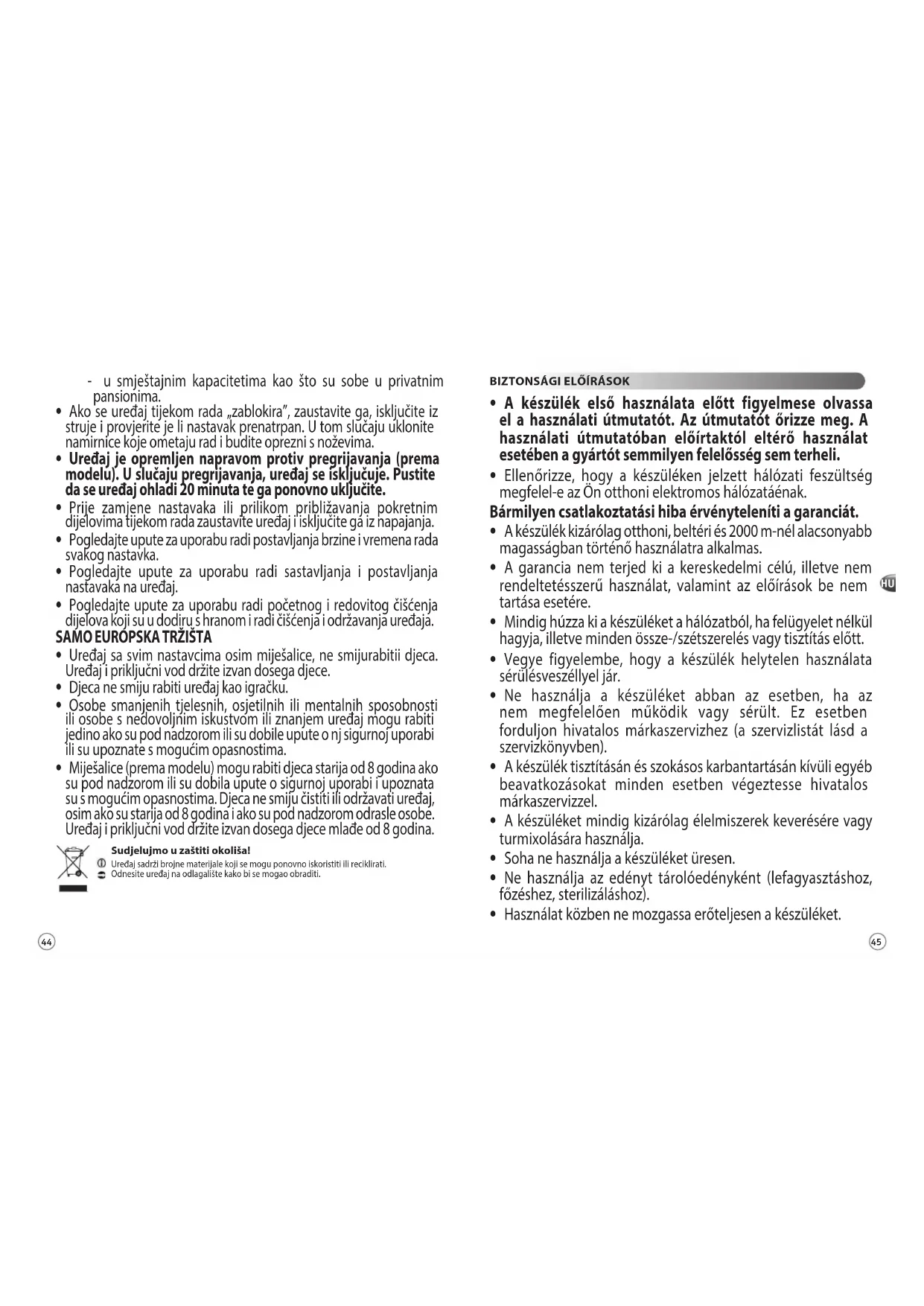 - Az élelmiszerrel érintkező részegységek első és rendszeres tisztítását, valamint a készülék tisztítását és karbantartását a használati útmutató ismerteti.