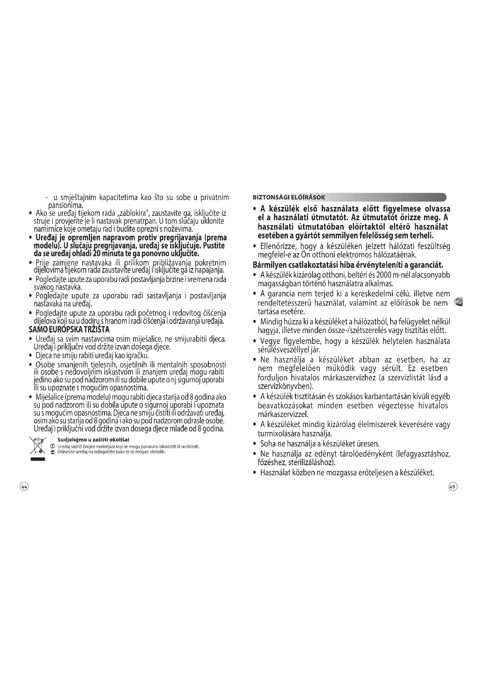 - Az élelmiszerrel érintkező részegységek első és rendszeres tisztítását, valamint a készülék tisztítását és karbantartását a használati útmutató ismerteti.