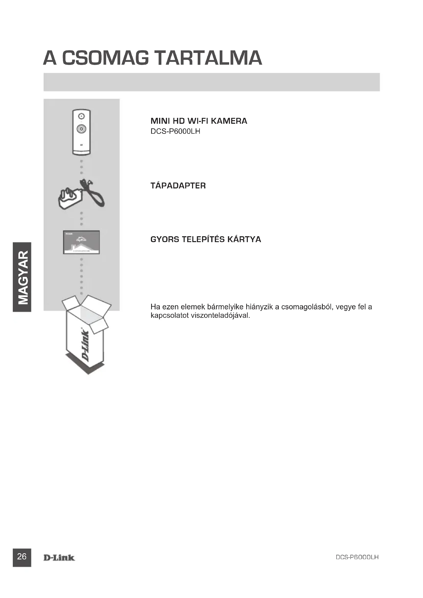 DCS-P6000LH TÁPADAPTER Ha ezen elemek bármelyike hiányzik a csomagolásból, vegye fel a kapcsolatot viszonteladójával. GYORS TELEPÍTÉS KÁRTYADCS-P6000LH