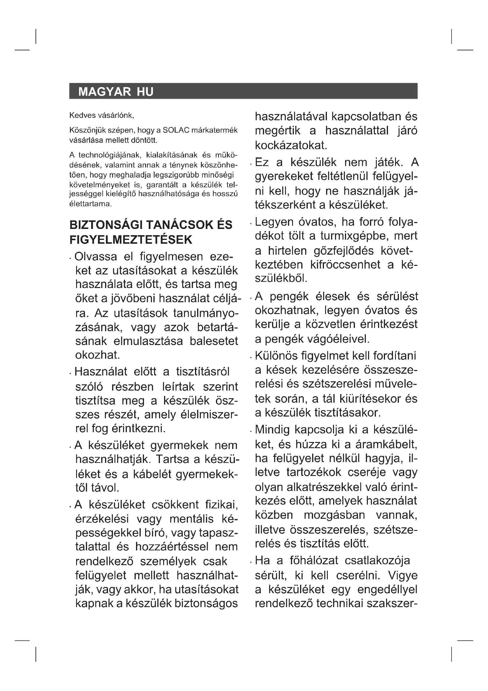 Kedves vásárlónk, Köszönjük szépen, hogy a SOLAC márkatermék vásárlása mellett döntött. A technológiájának, kialakításának és műkö- désének, valamint annak a ténynek köszönhe- tően, hogy meghaladja legszigorúbb minőségi követelményeket is, garantált a készülék tel- jességgel kielégítő használhatósága és hosszú élettartama.