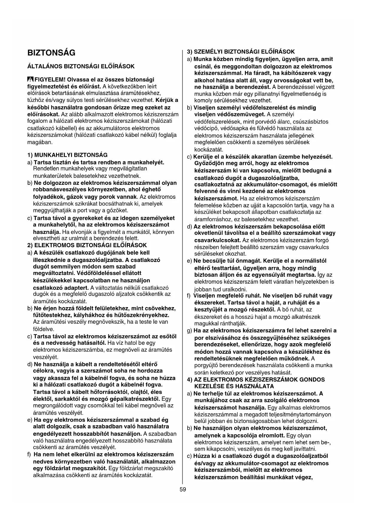 FIGYELEM! Olvassa el az összes biztonsági figyelmeztetéstéselőírást. A következőkben leírt előírások betartásának elmulasztása áramütésekhez, tűzhöz és/vagy súlyos testi sérülésekhez vezethet. Kérjük a későbbihasználatragondosanőrizzemegezeketaz előírásokat. Az alább alkalmazott elektromos kéziszerszám fogalom a hálózati elektromos kéziszerszámokat (hálózati csatlakozó kábellel) és az akkumulátoros elektromos kéziszerszámokat (hálózati csatlakozó kábel nélkül) foglalja magában.