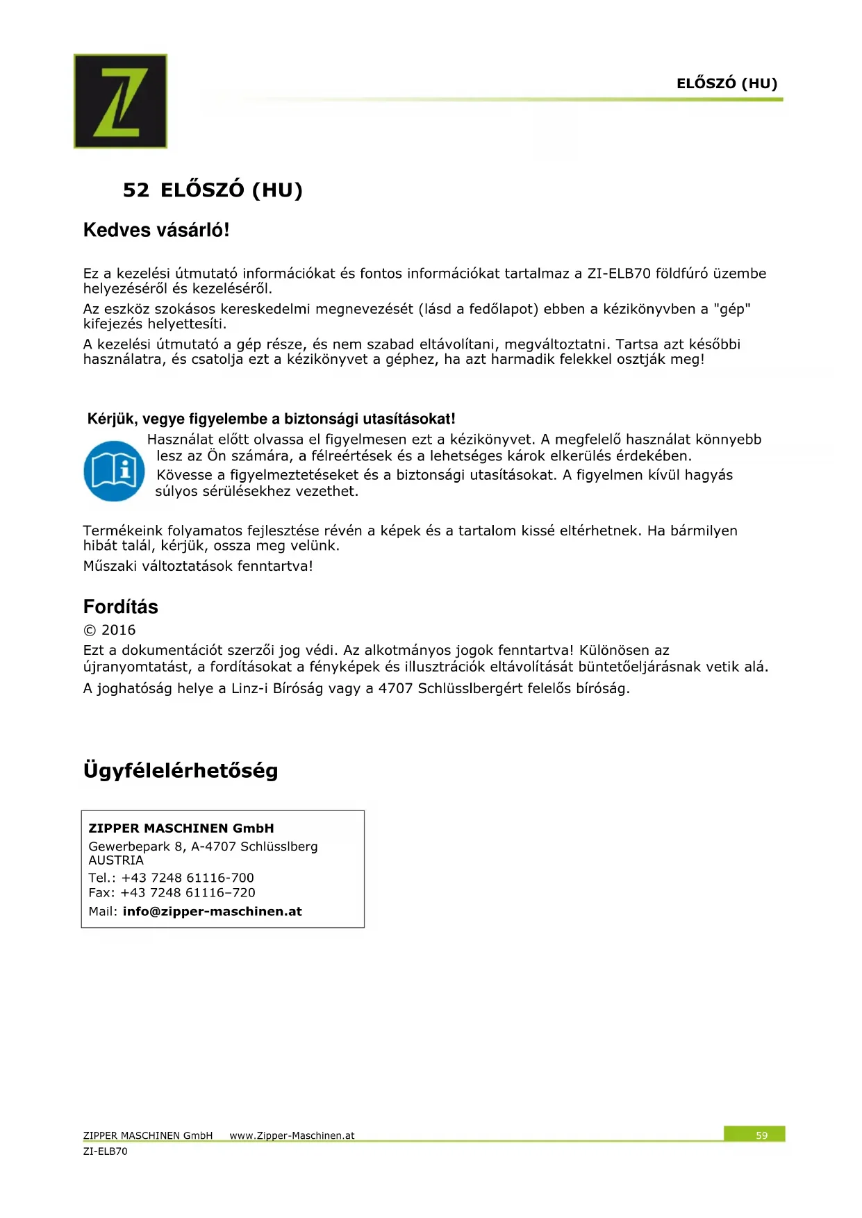 VAŽ NO! Ukoliko niste u mogućnosti ili niste dovoljno osposobljeni za samostalno izvođenje nužnih popravaka Vašeg uređaja, obratite se ovlaštenoj servisnoj službi.ELŐSZÓ (HU) ZIPPER MASCHINEN GmbH www.Zipper-Maschinen.at 59 ZI-ELB70 59 52 ELŐSZÓ (HU) Kedves vásárló! Ez a kezelési útmutató információkat és fontos információkat tartalmaz a ZI-ELB70 földfúró üzembe helyezéséről és kezeléséről. Az eszköz szokásos kereskedelmi megnevezését (lásd a fedőlapot) ebben a kézikönyvben a "gép" kifejezés helyettesíti. A kezelési útmutató a gép része, és nem szabad eltávolítani, megváltoztatni. Tartsa azt későbbi használatra, és csatolja ezt a kézikönyvet a géphez, ha azt harmadik felekkel osztják meg!