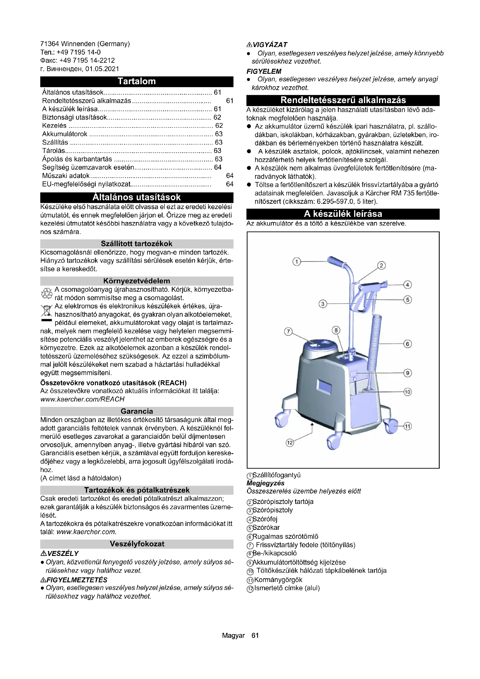 • 270 кПа) Ошибка Причина Устранение PS 4/7 Bp 1.007-085.0 PS 4/7 Bp *UK 1.007-086.0 Рабочие характеристики устройства Время работы с полностью заряженным аккумулятором h8 8 Аккумулятор Тип аккумулятора AGM AGM Емкость аккумулятора Ah 7 7 Время зарядки, когда батарея полностью разряжена h5 5 Напряжение аккумулятора V12 12 Предохранитель A5 5 Зарядное устройство Напряжение сети V 230 240 Фаза ~1 1 Частота Hz 50 50 Условия окружающей среды Температура окружающей среды °C -5 bis +40 -5 bis +40 Влажность воздуха, без образования росы % 0 - 90 0 - 90 Размеры и вес Длина х ширина х высота mm 510 x 380 x 960 510 x 380 x 960 Объем бака для чистой воды l3,9 3,9 Рабочее давление MPa 0,68 0,68 Расход, моющее средство l/min 0,19 0,19 Вес kg 13,6 13,6Magyar 61 71364 Winnenden (Germany) Тел.: +49 7195 14-0 Факс: +49 7195 14-2212 г. Винненден, 01.05.2021 Tartalom Általános utasítások Készüléke első használata előtt olvassa el ezt az eredeti kezelési útmutatót, és ennek megfelelően járjon el. Őrizze meg az eredeti kezelési útmutatót későbbi használatra vagy a következő tulajdo- nos számára. Szállított tartozékok Kicsomagolásnál ellenőrizze, hogy megvan-e minden tartozék. Hiányzó tartozékok vagy szállítási sérülések esetén kérjük, érte- sítse a kereskedőt. Környezetvédelem A csomagolóanyag újrahasznosítható. Kérjük, környezetba- rát módon semmisítse meg a csomagolást. Az elektromos és elektronikus készülékek értékes, újra- hasznosítható anyagokat, és gyakran olyan alkotóelemeket, például elemeket, akkumulátorokat vagy olajat is tartalmaz- nak, melyek nem megfelelő kezelése vagy helytelen megsemmi- sítése potenciális veszélyt jelenthet az emberek egészségre és a környezetre. Ezek az alkotóelemek azonban a készülék rendel- tetésszerű üzemeléséhez szükségesek. Az ezzel a szimbólum- mal jelölt készülékeket nem szabad a háztartási hulladékkal együtt megsemmisíteni. Összetevőkre vonatkozó utasítások (REACH) Az összetevőkre vonatkozó aktuális információkat itt találja: www.kaercher.com/REACH Garancia Minden országban az illetékes értékesítő társaságunk által meg- adott garanciális feltételek vannak érvényben. A készüléknél fel- merülő esetleges zavarokat a garanciaidőn belül díjmentesen orvosoljuk, amennyiben anyag-, illetve gyártási hibáról van szó. Garanciális esetben kérjük, a számlával együtt forduljon kereske- dőjéhez vagy a legközelebbi, arra jogosult ügyfélszolgálati irodá- hoz. (A címet lásd a hátoldalon) Tartozékok és pótalkatrészek Csak eredeti tartozékot és eredeti pótalkatrészt alkalmazzon; ezek garantálják a készülék biztonságos és zavarmentes üzeme- lését. A tartozékokra és pótalkatrészekre vonatkozóan információkat itt talál: www.kaercher.com. Veszélyfokozat VESZÉLY ● Olyan, közvetlenül fenyegető veszély jelzése, amely súlyos sé- rülésekhez vagy halálhoz vezet. 몇 FIGYELMEZTETÉS ● Olyan, esetlegesen veszélyes helyzet jelzése, amely súlyos sé- rülésekhez vagy halálhoz vezethet. 몇 VIGYÁZAT ● Olyan, esetlegesen veszélyes helyzet jelzése, amely könnyebb sérülésekhez vezethet. FIGYELEM ● Olyan, esetlegesen veszélyes helyzet jelzése, amely anyagi károkhoz vezethet. Rendeltetésszerű alkalmazás A készüléket kizárólag a jelen használati utasításban lévő ada- toknak megfelelően használja. Az akkumulátor üzemű készülék ipari használatra, pl. szállo- dákban, iskolákban, kórházakban, gyárakban, üzletekben, iro- dákban és bérleményekben történő használatra készült. A készülék asztalok, polcok, ajtókilincsek, valamint nehezen hozzáférhető helyek fertőtlenítésére szolgál. A készülék nem alkalmas üvegfelületek fertőtlenítésére (ma- radványok láthatók). Töltse a fertőtlenítőszert a készülék frissvíztartályába a gyártó adatainak megfelelően. Javasoljuk a Kärcher RM 735 fertőtle- nítőszert (cikkszám: 6.295-597.0, 5 liter). A készülék leírása Az akkumulátor és a töltő a készülékbe van szerelve. 1 Szállítófogantyú Megjegyzés Összeszerelés üzembe helyezés előtt 2 Szórópisztoly tartója 3 Szórópisztoly 4 Szórófej 5 Szórókar 6 Rugalmas szórótömlő 7 Frissvíztartály fedele (töltőnyílás) 8 Be-/kikapcsoló 9 Akkumulátortöltöttség kijelzése 10 Töltőkészülék hálózati tápkábelének tartója 11 Kormánygörgők 12 Ismertető címke (alul) Általános utasítások p. 61