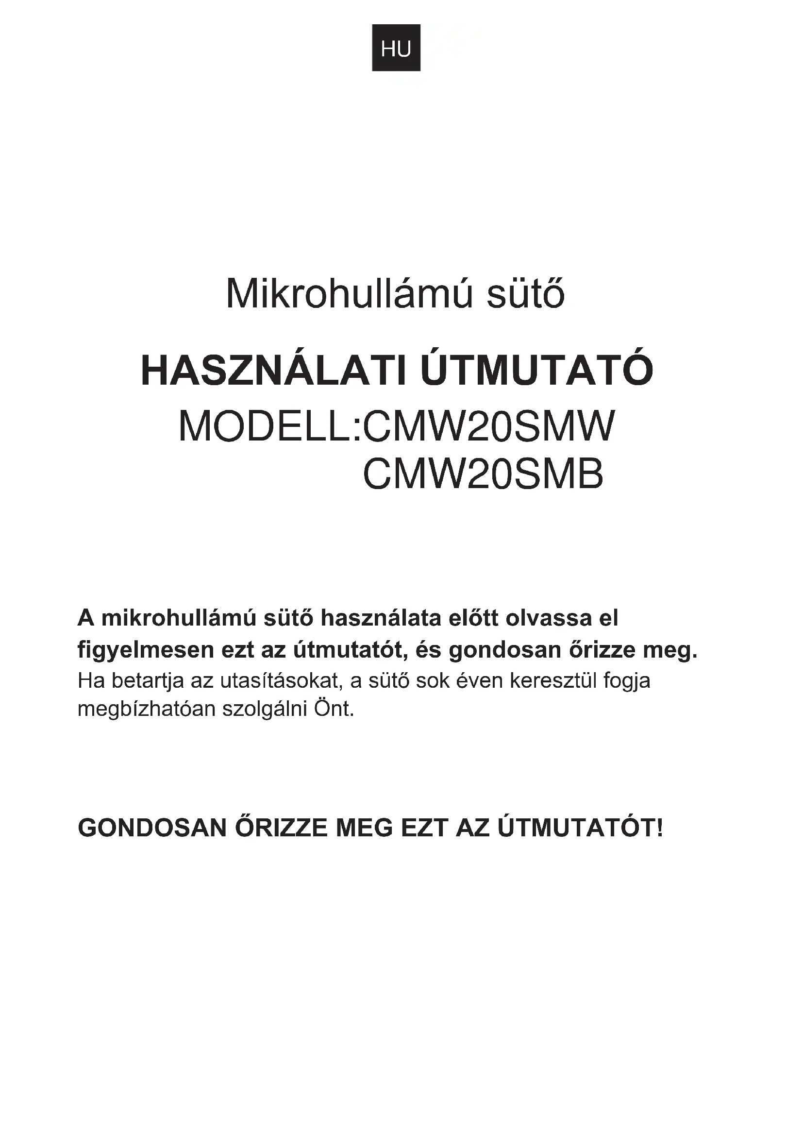 CMW20SMB A mikrohullámú sütő használata előtt olvassa el figyelmesen ezt az útmutatót, és gondosan őrizze meg. Ha betartja az utasításokat, a sütő sok éven keresztül fogja megbízhatóan szolgálni Önt. GONDOSAN ŐRIZZE MEG EZT AZ ÚTMUTATÓT!HU
