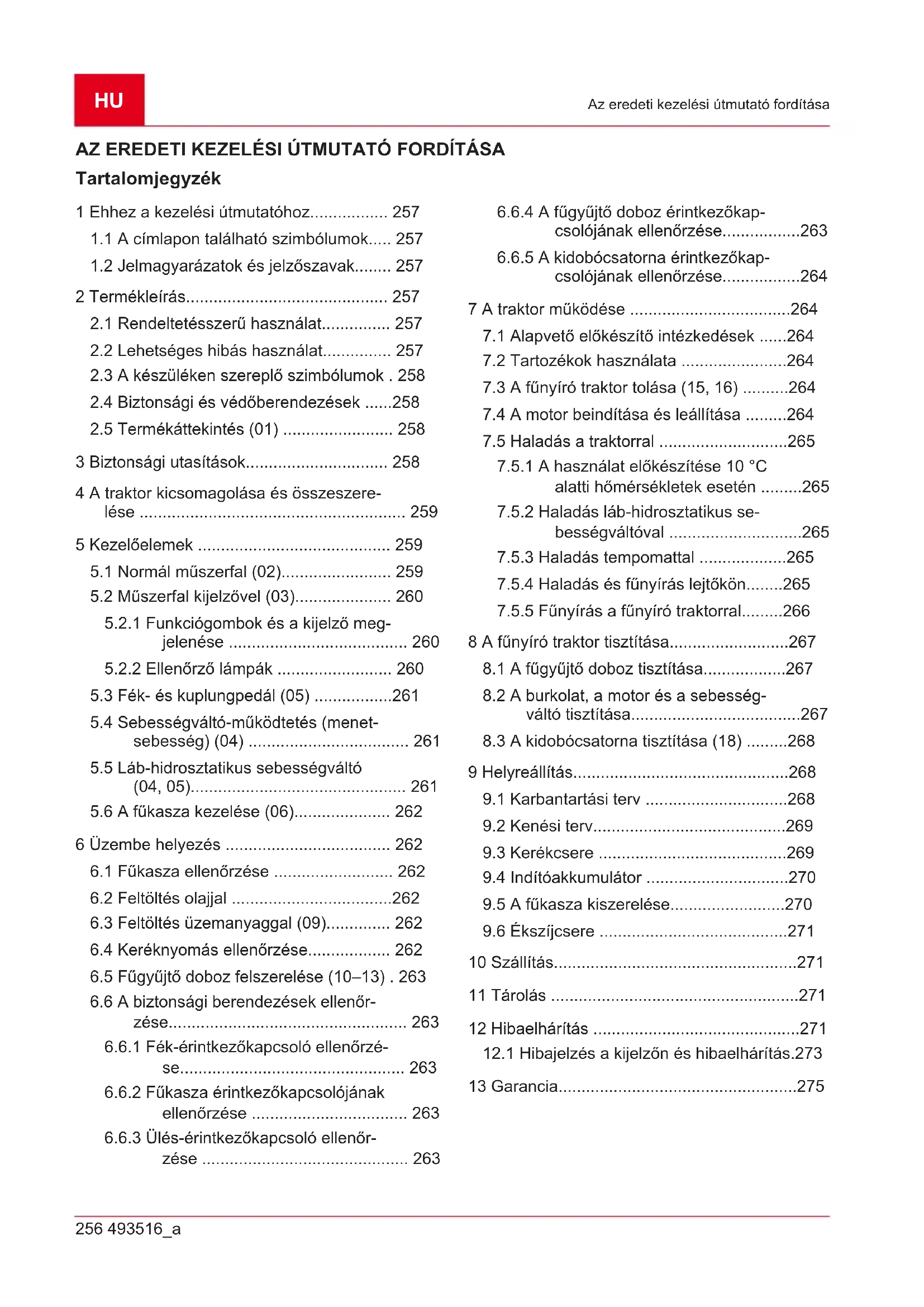 3 Biztonsági utasítások............................... 258 4 A traktor kicsomagolása és összeszere- lése .......................................................... 259 5 Kezelőelemek .......................................... 259