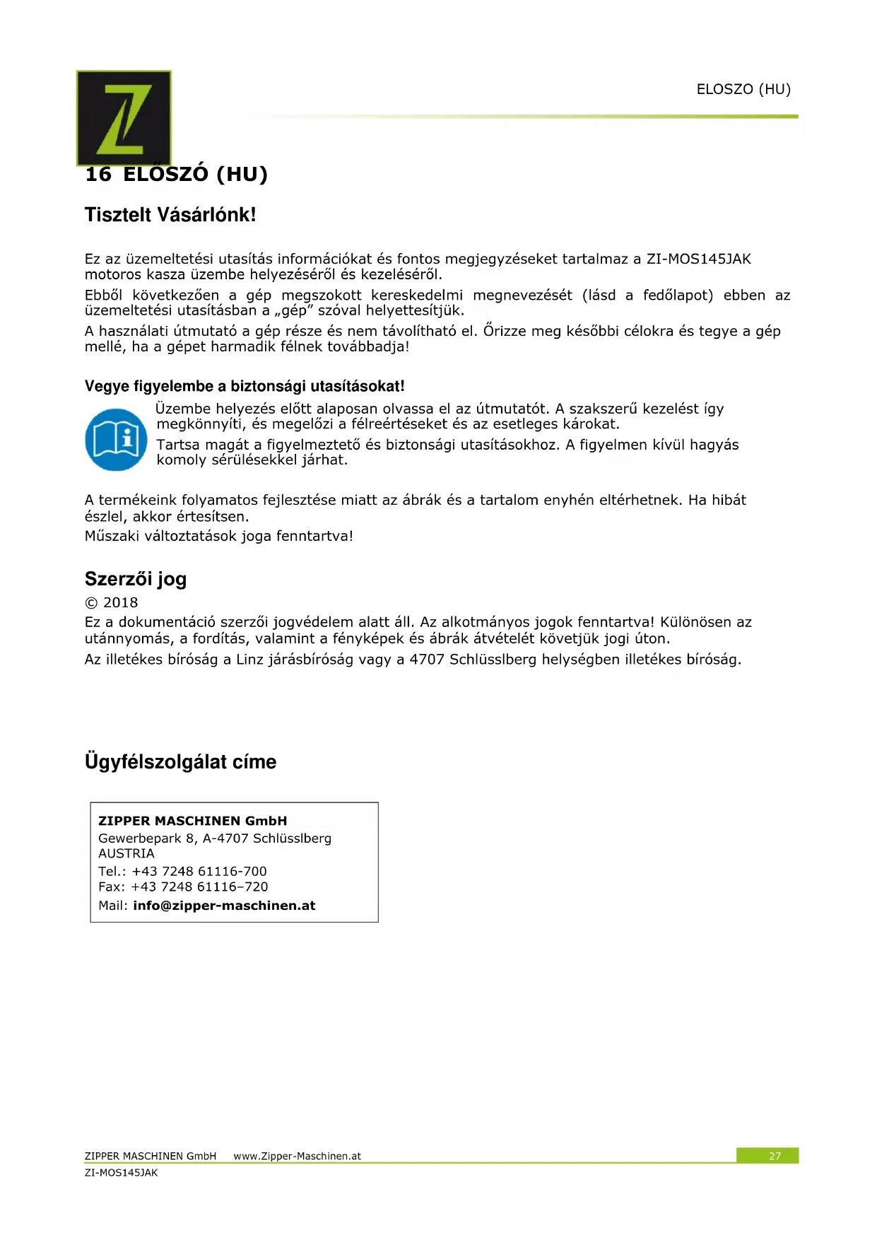 NOTICE Should you in necessary repairs not able to properly to perform or you have not the prescribed training for it always attract a workshop to fix the problem.ELOSZO (HU) ZIPPER MASCHINEN GmbH www.Zipper-Maschinen.at 27 ZI-MOS145JAK 16 ELŐSZÓ (HU) Tisztelt Vásárlónk! Ez az üzemeltetési utasítás információkat és fontos megjegyzéseket tartalmaz a ZI-MOS145JAK motoros kasza üzembe helyezéséről és kezeléséről. Ebből következően a gép megszokott kereskedelmi megnevezését (lásd a fedőlapot) ebben az üzemeltetési utasításban a „gép” szóval helyettesítjük. A használati útmutató a gép része és nem távolítható el. Őrizze meg későbbi célokra és tegye a gép mellé, ha a gépet harmadik félnek továbbadja! Vegye figyelembe a biztonsági utasításokat! Üzembe helyezés előtt alaposan olvassa el az útmutatót. A szakszerű kezelést így megkönnyíti, és megelőzi a félreértéseket és az esetleges károkat. Tartsa magát a figyelmeztető és biztonsági utasításokhoz. A figyelmen kívül hagyás komoly sérülésekkel járhat. A termékeink folyamatos fejlesztése miatt az ábrák és a tartalom enyhén eltérhetnek. Ha hibát észlel, akkor értesítsen. Műszaki változtatások joga fenntartva! Szerzői jog © 2018 Ez a dokumentáció szerzői jogvédelem alatt áll. Az alkotmányos jogok fenntartva! Különösen az utánnyomás, a fordítás, valamint a fényképek és ábrák átvételét követjük jogi úton. Az illetékes bíróság a Linz járásbíróság vagy a 4707 Schlüsslberg helységben illetékes bíróság.