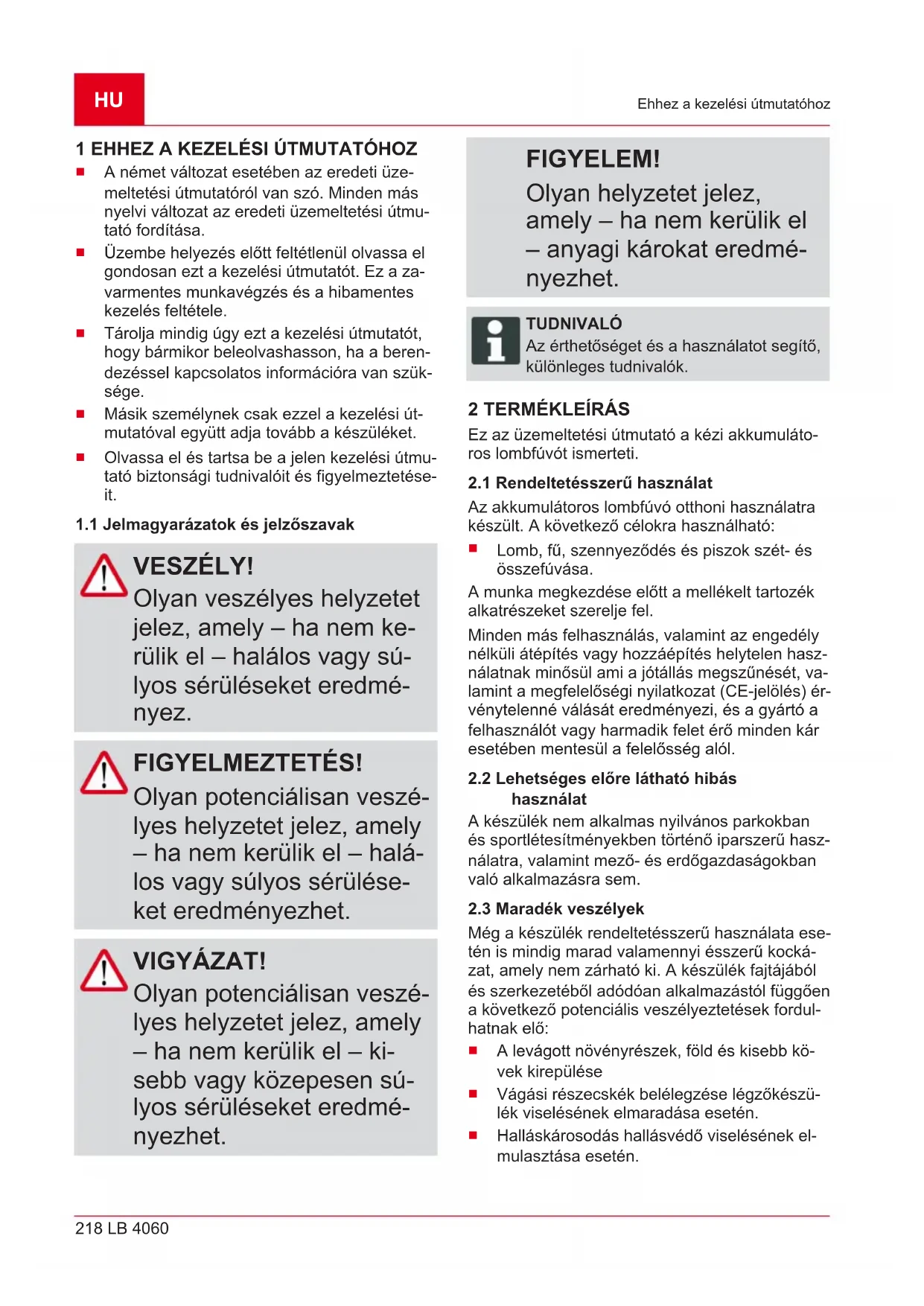 Ez az üzemeltetési útmutató a kézi akkumuláto- ros lombfúvót ismerteti.