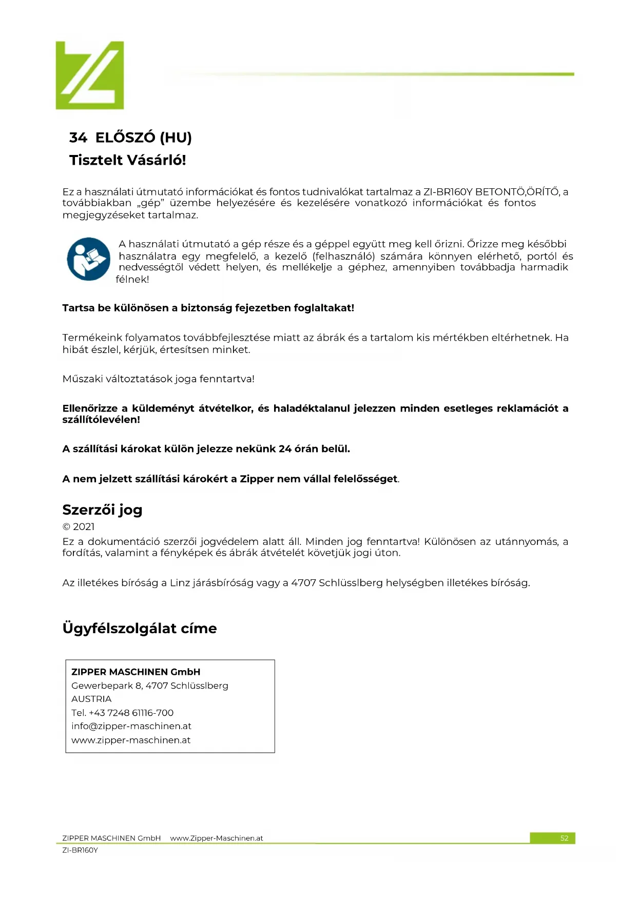 Pridržavajte se nacionalnih propisa o odlaganju otpada. Nemojte odlagati mašinu, komponente mašine ili radna sredstva s ostalim otpadom. Ako je potrebno, obratite se lokalnim vlastima za informacije o dostupnim opcijama odlaganja. Kupovinom nove mašine ili ekvivalentne opreme od vašeg prodavca, prodavac je dužan u određenim zemljama da pravilno odloži vašu staru mašinu.ZIPPER MASCHINEN GmbH www.Zipper-Maschinen.at 52 ZI-BR160Y 34 ELŐSZÓ (HU) Tisztelt Vásárló! Ez a használati útmutató információkat és fontos tudnivalókat tartalmaz a ZI-BR160Y BETONTÖ,ÖRÍTŐ, a továbbiakban „gép” üzembe helyezésére és kezelésére vonatkozó információkat és fontos megjegyzéseket tartalmaz. A használati útmutató a gép része és a géppel együtt meg kell őrizni. Őrizze meg későbbi használatra egy megfelelő, a kezelő (felhasználó) számára könnyen elérhető, portól és nedvességtől védett helyen, és mellékelje a géphez, amennyiben továbbadja harmadik félnek! Tartsa be különösen a biztonság fejezetben foglaltakat! Termékeink folyamatos továbbfejlesztése miatt az ábrák és a tartalom kis mértékben eltérhetnek. Ha hibát észlel, kérjük, értesítsen minket. Műszaki változtatások joga fenntartva! Ellenőrizze a küldeményt átvételkor, és haladéktalanul jelezzen minden esetleges reklamációt a szállítólevélen! A szállítási károkat külön jelezze nekünk 24 órán belül. A nem jelzett szállítási károkért a Zipper nem vállal felelősséget. Szerzői jog © 2021 Ez a dokumentáció szerzői jogvédelem alatt áll. Minden jog fenntartva! Különösen az utánnyomás, a fordítás, valamint a fényképek és ábrák átvételét követjük jogi úton. Az illetékes bíróság a Linz járásbíróság vagy a 4707 Schlüsslberg helységben illetékes bíróság.