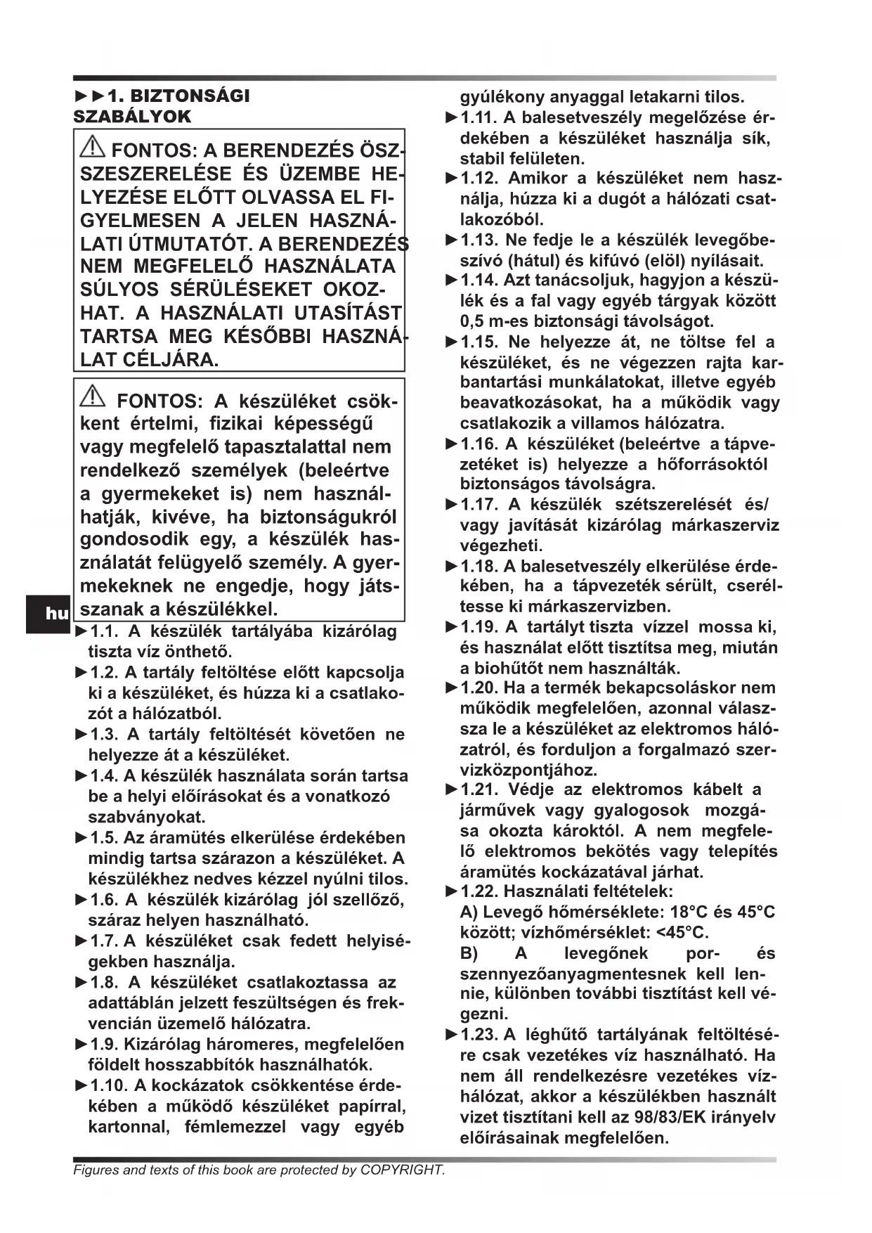 LAT CÉLJÁRA. FONTOS: A készüléket csök- kent értelmi, zikai képességű vagy megfelelő tapasztalattal nem rendelkező személyek (beleértve a gyermekeket is) nem használ- hatják, kivéve, ha biztonságukról gondosodik egy, a készülék has- ználatát felügyelő személy. A gyer- mekeknek ne engedje, hogy játs- szanak a készülékkel. ►1.1. A készülék tartályába kizárólag tiszta víz önthető. ►1.2. A tartály feltöltése előtt kapcsolja ki a készüléket, és húzza ki a csatlako- zót a hálózatból. ►1.3. A tartály feltöltését követően ne helyezze át a készüléket. ►1.4. A készülék használata során tartsa be a helyi előírásokat és a vonatkozó szabványokat. ►1.5. Az áramütés elkerülése érdekében mindig tartsa szárazon a készüléket. A készülékhez nedves kézzel nyúlni tilos. ►1.6. A készülék kizárólag jól szellőző, száraz helyen használható. ►1.7. A készüléket csak fedett helyisé- gekben használja. ►1.8. A készüléket csatlakoztassa az adattáblán jelzett feszültségen és frek- vencián üzemelő hálózatra. ►1.9. Kizárólag háromeres, megfelelően földelt hosszabbítók használhatók. ►1.10. A kockázatok csökkentése érde- kében a működő készüléket papírral, kartonnal, fémlemezzel vagy egyéb gyúlékony anyaggal letakarni tilos. ►1.11. A balesetveszély megelőzése ér- dekében a készüléket használja sík, stabil felületen. ►1.12. Amikor a készüléket nem hasz- nálja, húzza ki a dugót a hálózati csat- lakozóból. ►1.13. Ne fedje le a készülék levegőbe- szívó (hátul) és kifúvó (elöl) nyílásait. ►1.14. Azt tanácsoljuk, hagyjon a készü- lék és a fal vagy egyéb tárgyak között 0,5 m-es biztonsági távolságot. ►1.15. Ne helyezze át, ne töltse fel a készüléket, és ne végezzen rajta kar- bantartási munkálatokat, illetve egyéb beavatkozásokat, ha a működik vagy csatlakozik a villamos hálózatra. ►1.16. A készüléket (beleértve a tápve- zetéket is) helyezze a hőforrásoktól biztonságos távolságra. ►1.17. A készülék szétszerelését és/ vagy javítását kizárólag márkaszerviz végezheti. ►1.18. A balesetveszély elkerülése érde- kében, ha a tápvezeték sérült, cserél- tesse ki márkaszervizben. ►1.19. A tartályt tiszta vízzel mossa ki, és használat előtt tisztítsa meg, miután a biohűtőt nem használták. ►1.20. Ha a termék bekapcsoláskor nem működik megfelelően, azonnal válasz- sza le a készüléket az elektromos háló- zatról, és forduljon a forgalmazó szer- vizközpontjához. ►1.21. Védje az elektromos kábelt a járművek vagy gyalogosok mozgá- sa okozta károktól. A nem megfele- lő elektromos bekötés vagy telepítés áramütés kockázatával járhat. ►1.22. Használati feltételek: A) Levegő hőmérséklete: 18°C és 45°C között; vízhőmérséklet: <45°C. B) A levegőnek por- és szennyezőanyagmentesnek kell len- nie, különben további tisztítást kell vé- gezni. ►1.23. A léghűtő tartályának feltöltésé- re csak vezetékes víz használható. Ha nem áll rendelkezésre vezetékes víz- hálózat, akkor a készülékben használt vizet tisztítani kell az 98/83/EK irányelv előírásainak megfelelően.Figures and texts of this book are protected by COPYRIGHT.