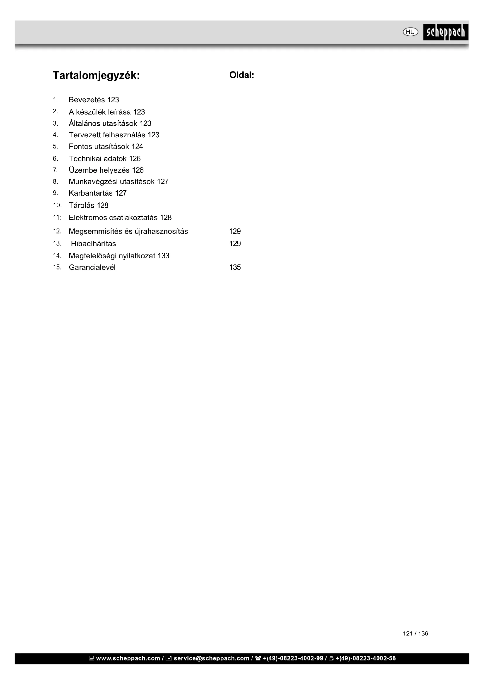 A készüléket és tartozékait sötét, száraz és fagymen- tes helyen, gyermekektől elzárva tárolja. Az optimális tárolási hőmérséklet 5 és 30˚C között van. Az elektromos szerszámot az eredeti csomagolásában őrizze. Takarja le az elektromos szerszámot, ezzel védve por- tól és nedvességtől. A kezelési útmutatót az elektromos szerszámmal együtt őrizze meg. HU www.scheppach.com / service@scheppach.com / +(49)-08223-4002-99 / +(49)-08223-4002-58 129 / 136