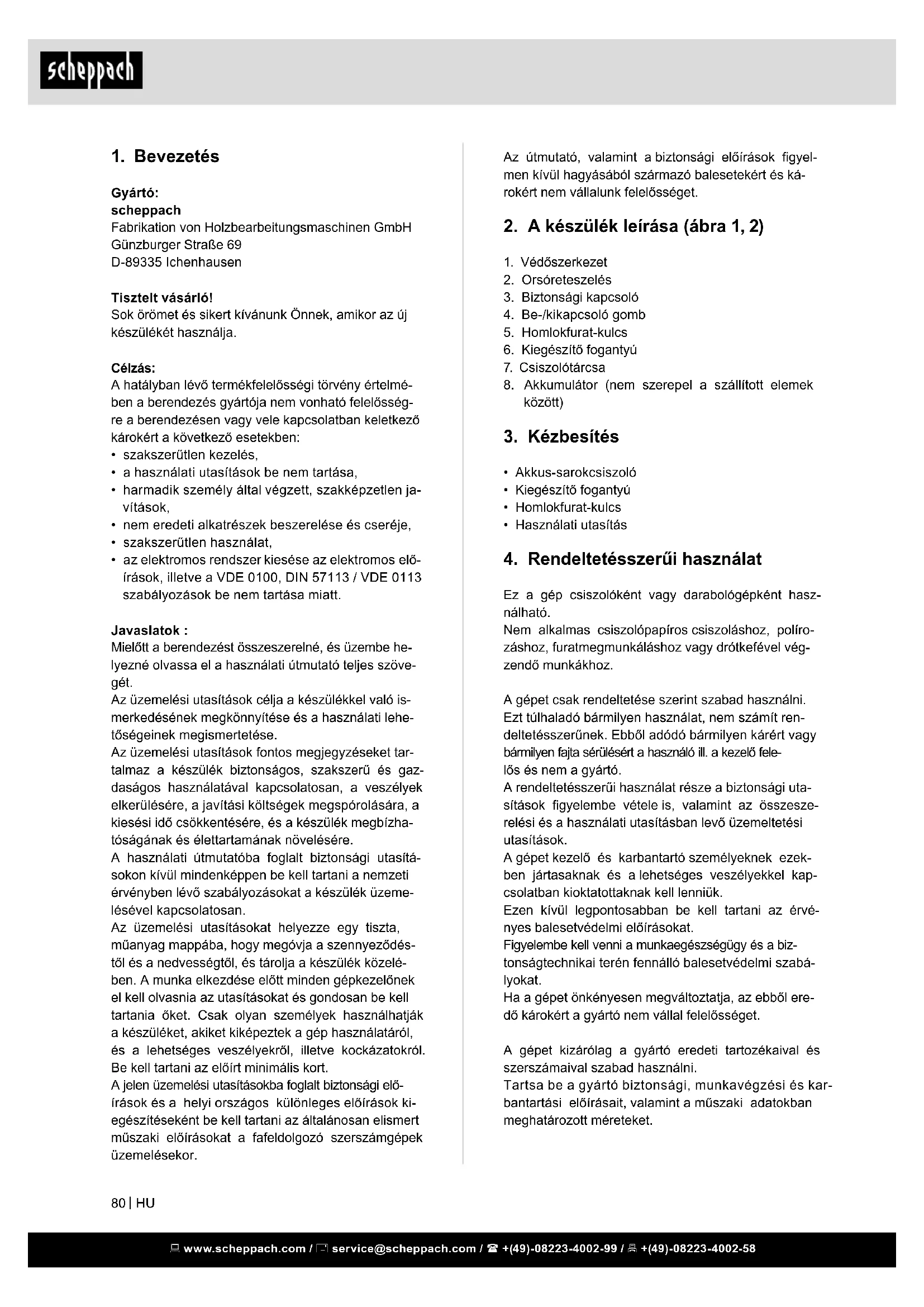 Gyártó: scheppach Fabrikation von Holzbearbeitungsmaschinen GmbH Günzburger Straße 69 D-89335 Ichenhausen Tisztelt vásárló! Sok örömet és sikert kívánunk Önnek, amikor az új készülékét használja. Célzás: A hatályban lévő termékfelelősségi törvény értelmé- ben a berendezés gyártója nem vonható felelősség- re a berendezésen vagy vele kapcsolatban keletkező károkért a következő esetekben: