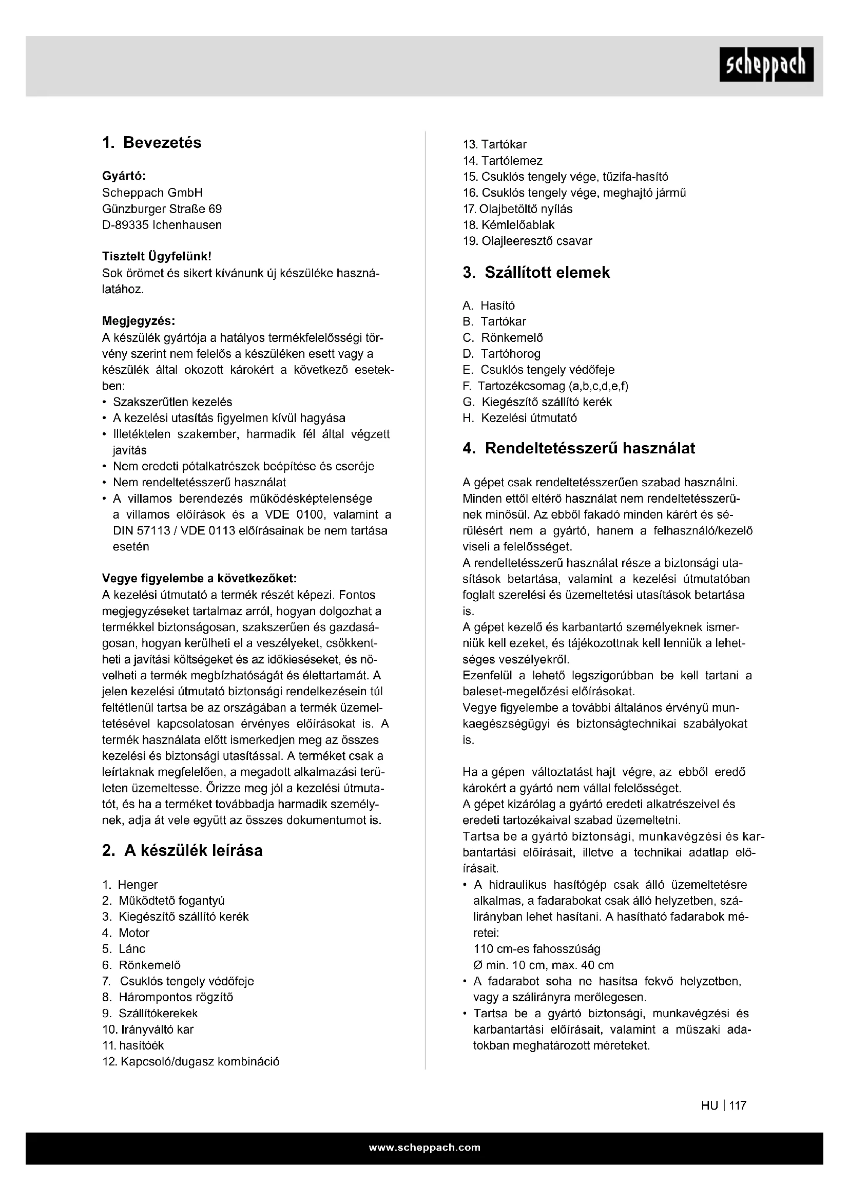 Gyártó: Scheppach GmbH Günzburger Straße 69 D-89335 Ichenhausen Tisztelt Ügyfelünk! Sok örömet és sikert kívánunk új készüléke haszná- latához. Megjegyzés: A készülék gyártója a hatályos termékfelelősségi tör- vény szerint nem felelős a készüléken esett vagy a készülék által okozott károkért a következő esetek- ben: