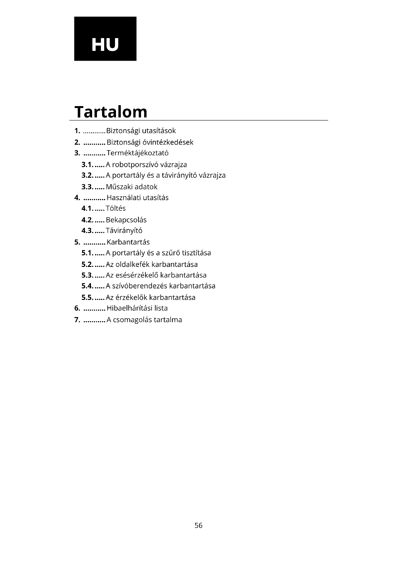5.1. ..... A portartály és a szűrő tisztítása 5.2. ..... Az oldalkefék karbantartása 5.3. ..... Az esésérzékelő karbantartása 5.4. ..... A szívóberendezés karbantartása 5.5. ..... Az érzékelők karbantartása