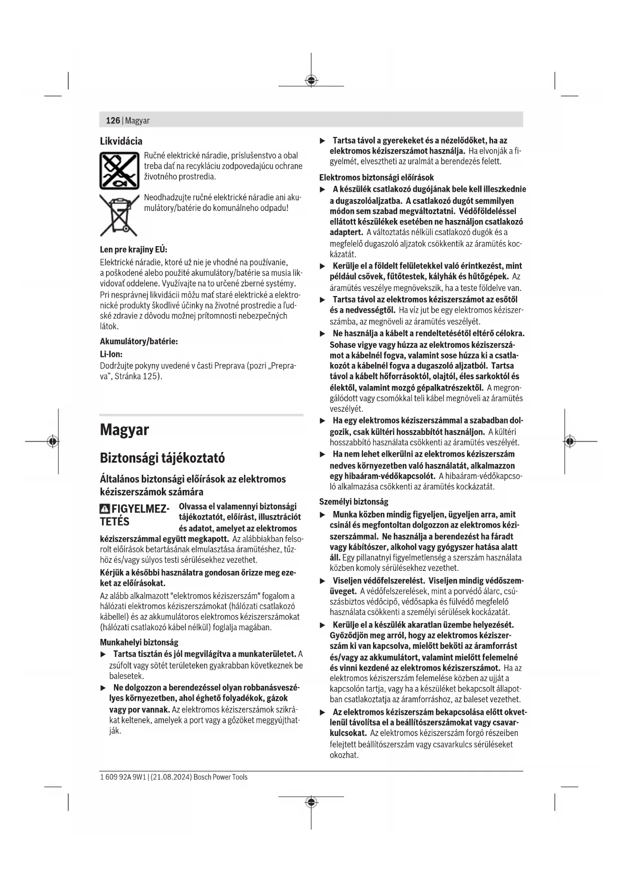 20−25°C hőmérsékleten aGBA18V4.0Ah akkumulátorral mérve. B) a felhasznált akkumulátortól függően C) <0°C hőmérsékletek mellett korlátozott teljesítmény A műszaki adatok a szállítmányhoz tartozó akkumulátorral került meg- határozásra. Az értékek termékenként változhatnak és függnek az alkalmazási, va- lamint környezeti feltételektől is. További információk a www.bosch-professional.com/wac címen találhatók. Zaj és vibráció értékek A zajkibocsátási értékek aEN IEC 62841-2-6szabványnak megfelelően kerültek meghatározásra. Az elektromos kéziszerszám A-értékelésű zajszintjének tipi- kus értékei: hangnyomásszint97dB(A); hangteljesítményszint105dB(A). A szórás, K=3dB. Viseljen fülvédőt! Az a