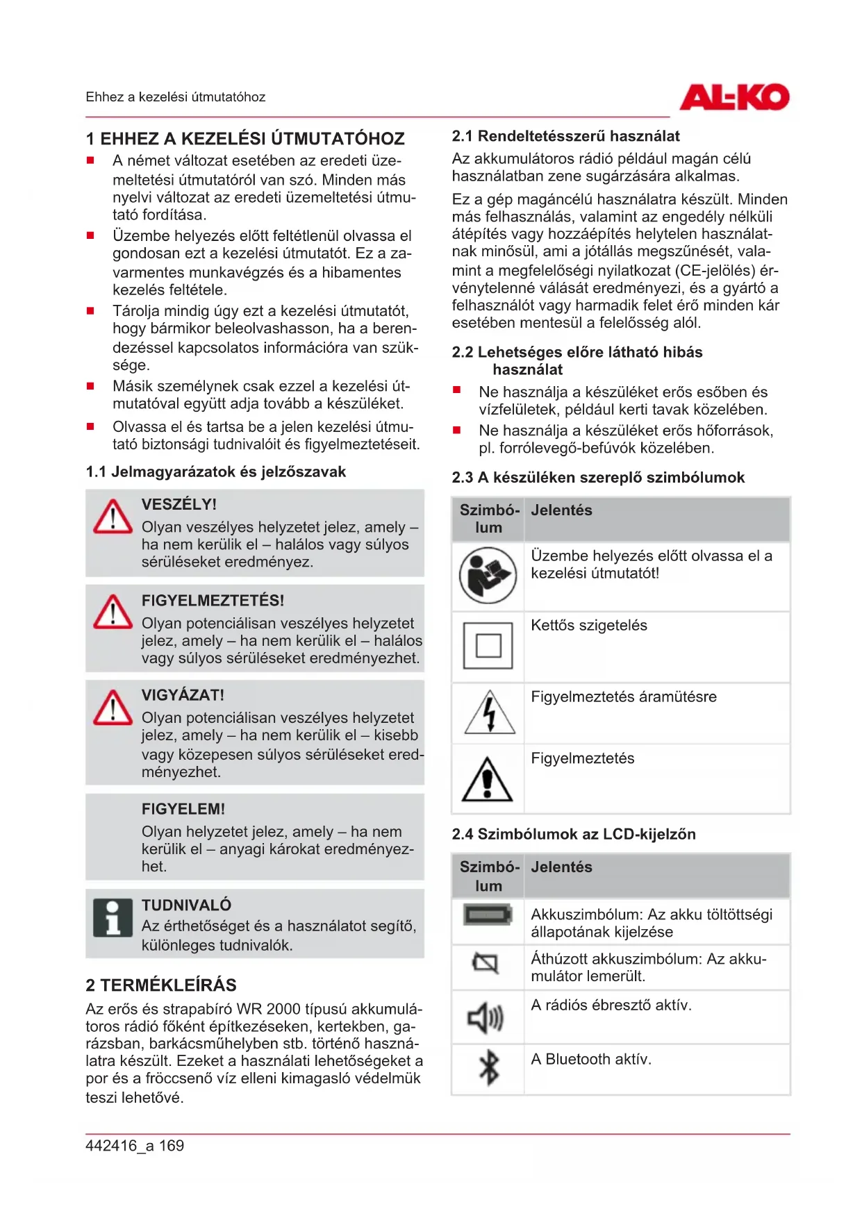 Töltse le az útmutatót a következőhöz Rádió PDF formátumban ingyenesen! Találja meg kézikönyvét WR 2000 - AL-KO és vegye vissza elektronikus eszközét a kezébe. Ezen az oldalon közzé van téve az eszköze használatához szükséges összes dokumentum. WR 2000 márka AL-KO.