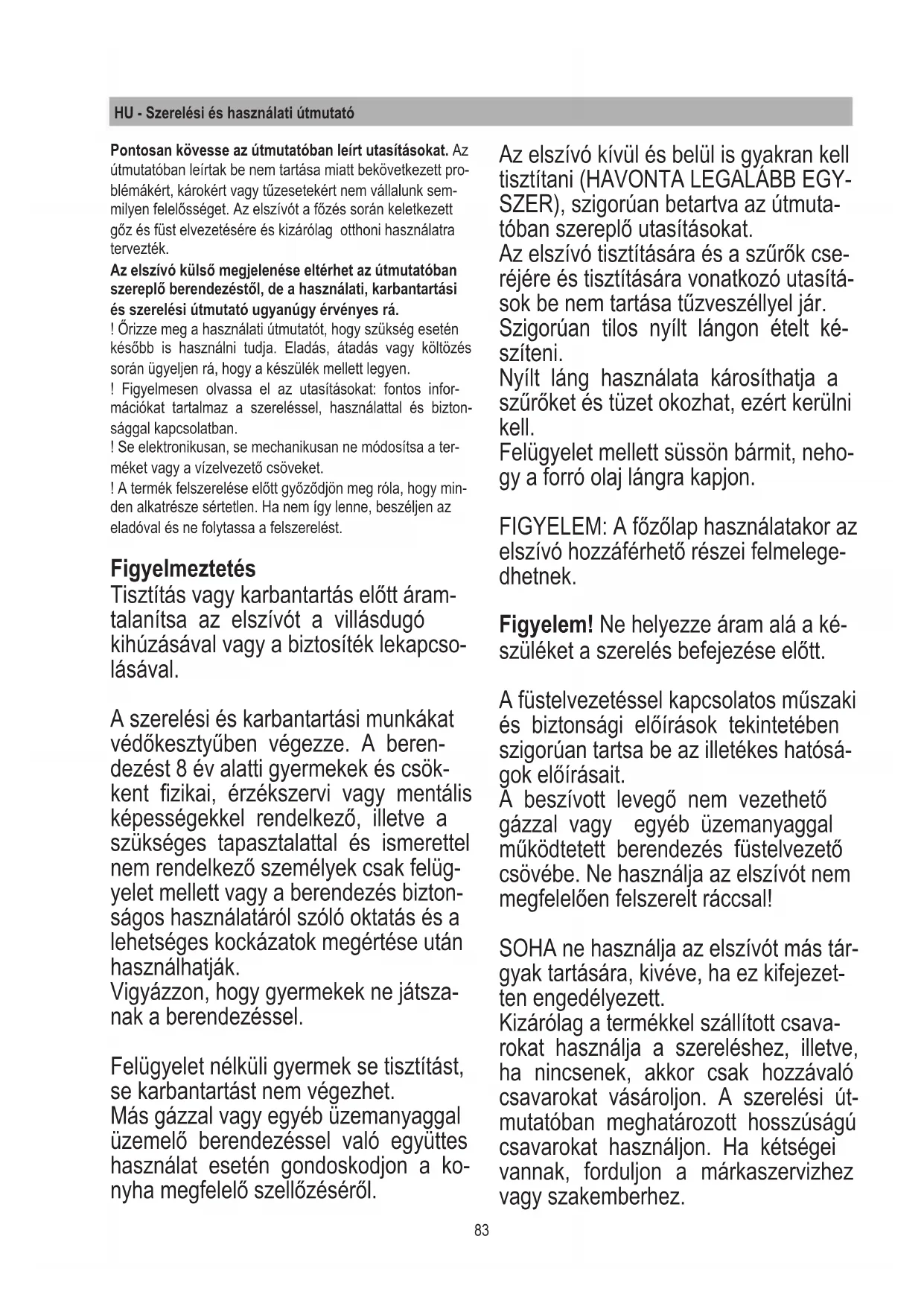 3-2; CEI/EN 61000-3-3. Hasznos tanácsok a környezeti károsodás csök- kentése érdekében: A főzés megkezdé- sekor a legkisebb fokozatban kapcsolja be az elszívót, a főzés után is hagyja bekapcsolva néhány percig. Csak nagy füst vagy gőz esetén kapcsolja maga- sabb fokozatba, a booster funkciót csak kivételes esetben használja. A szagel- szívó rendszer hatékonyságának fenn- tartásához cserélje ki a szűrőket, ami- kor az szükségessé válik. A zsírszűrő hatékonyságának fenntartásához tisztítsa ki, amikor az szükségessé válik. A hatékonyság növelése és a za- jcsökkentésérdekében az útmutatóban meghatározott legnagyobb átmérőjű csöveket használja. Felhasználás Az elszívó szabadba kivezetett vagy belső légtérben keringtető szénszűrős változatban használható. Szabadba kivezetett Az összekötőelem karimájára rögzített kimenő csövön át kerül kivezetésre a szabadba. A kimenő cső átmérőjének meg kell eg- yeznie a csatlakozó gyűrűjével. Figyelem! A kivezetőcső nem tartozék, külön kell beszerezni. A vízszintes ré- szen a cső enyhén lejtsen (kb. 10°), hogy könyebben kivezesse a levegőt. Az esetleges szénszűrőket ki kell venni.85 Szűrős változat A beszívott levegőt zsírtalanítja, mielőtt visszaforgatja a helységbe. Ha ebben az üzemmódban használja az elszívót, szükséges beszerelni a szénszűrőket. Megjegyzés: A szénszűrökön átvezetett levegőt egy, a berendezés oldalán talál- ható csövön át jut vissza a konyhába. Szerelés Megjegyzés: oly módon kell felszerelni, hogy karbantartás esetén bármikor hoz- zá lehessen férni az elszívóhoz és az elektromos alkatrészekhez. FIGYELMEZTETÉS: Az elektromos alkatrészeket tartalmazó fémdoboz ne legyen közelebb, mint 65 cm a gázfőzőlaphoz és 65 cm-re legyen az elszívó beszívójától. JÓ TANÁCS Javasoljuk, hogy az elektro- mos alkatrészeket tartalmazó fémdoboz legalább 10 cm-re legyen a plafontól és megfelelő távolságra a hőforrásoktól (pl.: sütő oldalától, vagy a főzőlaptól). Ha a gázfőzőlap szerelési útmutatójában nagyobb távolság szerepel, akkor azt kell gyelembe venni. Elektromos csatlakozás Az elszívó bekötését szakemberrel vé- geztesse. A hálózati feszültség feleljen meg az el- szívó hátoldalán lévő címkén jelzett ér- téknek. Ha villásdugóval ellátott, akkor olyan szabványos dugaljba dugja be, ahol szerelés után is hozzáférhető lesz. Ha nincs hozzá villásdugó (közvetlen kapcsolat a hálózatra) vagy a szerelés után nem lenne hozzáférhető a dugalj, akkor kössön rá egy szabványos bifázi- sú kapcsolót, amely III. kategóriájú túlfeszültség esetén meg- szünteti az áramellátást és megfelel a szerelési szabályoknak. Figyelem! Mielőtt újra áram alá hel- yezné a készüléket, illetve ellenőrízné a megfelelő működést, vizsgálja meg, hogy a betáp megfelelően lett e felsze- relve. Szerelés Mielőtt felszerelné a készüléket, győződjön meg arról, hogy minden alkatrész sérülésmentes legyen, ellenkező esetben keresse a viszonte- ladót és ne fogjon bele a szerelésbe. Gondosan olvassa el az alábbi utasítá- sokat. Legfeljebb 5 m hosszú elszívó csövet használjon.