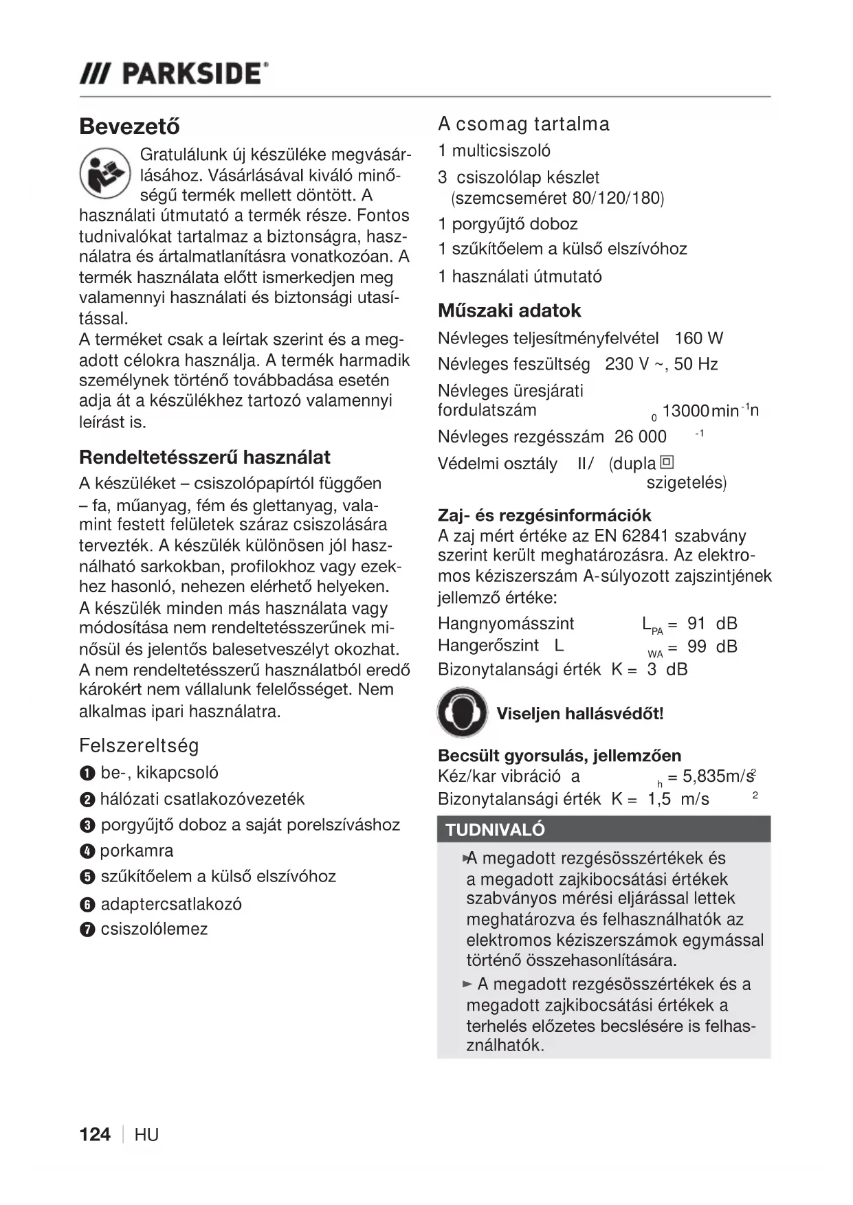 ֺHU %HYH]HWŤ Gratulálunk új készüléke megvásár- OûVûKR]9ûVûUOûVûYDONLYûOŒPLQŤ- VĝJƆWHUPĝNPHOOHWWGŚQWŚWW$ használati útmutató a termék része. Fontos tudnivalókat tartalmaz a biztonságra, hasz- QûODWUDĝVûUWDOPDWODQķWûVUDYRQDWNR]ŒDQ$ WHUPĝNKDV]QûODWDHOŤWWLVPHUNHGMHQPHJ YDODPHQQ\LKDV]QûODWLĝVEL]WRQVûJLXWDVķ- tással. $WHUPĝNHWFVDNDOHķUWDNV]HULQWĝVDPHJ- adott célokra használja. A termék harmadik V]HPĝO\QHNWŚUWĝQŤWRYûEEDGûVDHVHWĝQ adja át a készülékhez tartozó valamennyi OHķUûVWLV 5HQGHOWHWĝVV]HUƆKDV]QûODW $NĝV]żOĝNHW֑FVLV]ROŒSDSķUWŒOIżJJŤHQ ֑IDPƆDQ\DJIĝPĝVJOHWWDQ\DJYDOD- mint festett felületek száraz csiszolására tervezték. A készülék különösen jól hasz- QûOKDWŒVDUNRNEDQSURƞORNKR]YDJ\H]HN- KH]KDVRQOŒQHKH]HQHOĝUKHWŤKHO\HNHQ A készülék minden más használata vagy PŒGRVķWûVDQHPUHQGHOWHWĝVV]HUƆQHNPL- QŤVżOĝVMHOHQWŤVEDOHVHWYHV]ĝO\WRNR]KDW $QHPUHQGHOWHWĝVV]HUƆKDV]QûODWEŒOHUHGŤ NûURNĝUWQHPYûOODOXQNIHOHOŤVVĝJHW1HP alkalmas ipari használatra. Felszereltség 1 be-, kikapcsoló 2 hálózati csatlakozóvezeték 3SRUJ\ƆMWŤGRER]DVDMûWSRUHOV]ķYûVKR] 4 porkamra 5V]ƆNķWŤHOHPDNżOVŤHOV]ķYŒKR] 6 adaptercsatlakozó 7 csiszolólemez A csomag tartalma 1 multicsiszoló 3 csiszolólap készlet (szemcseméret 80/120/180)