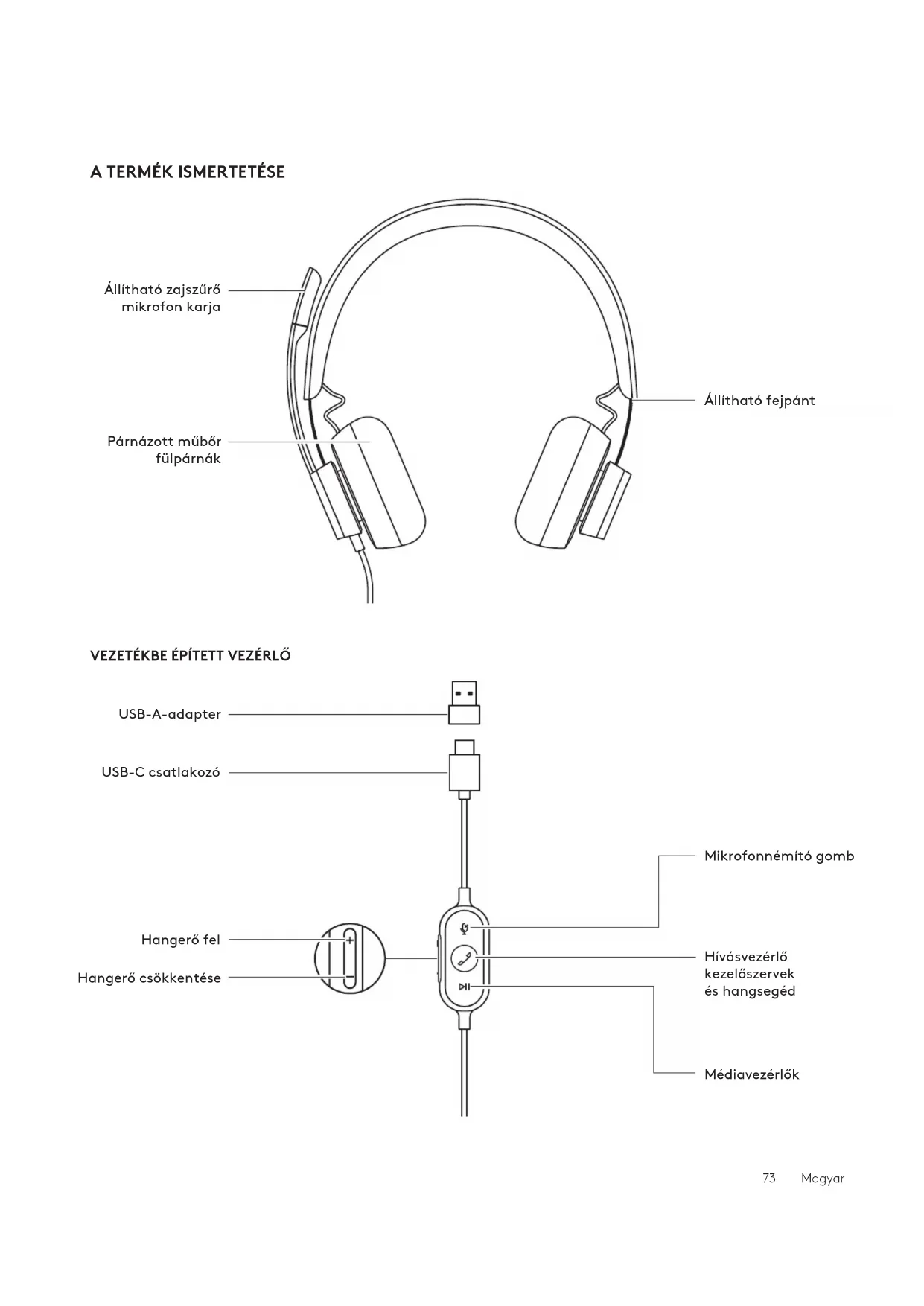 Mikrofonnémító gomb Hívásvezérlő kezelőszervek éshangsegéd Hangerő fel Hangerő csökkentése USB-C csatlakozó USB-A-adapter Médiavezérlők 73 MagyarUSB-A USB-C