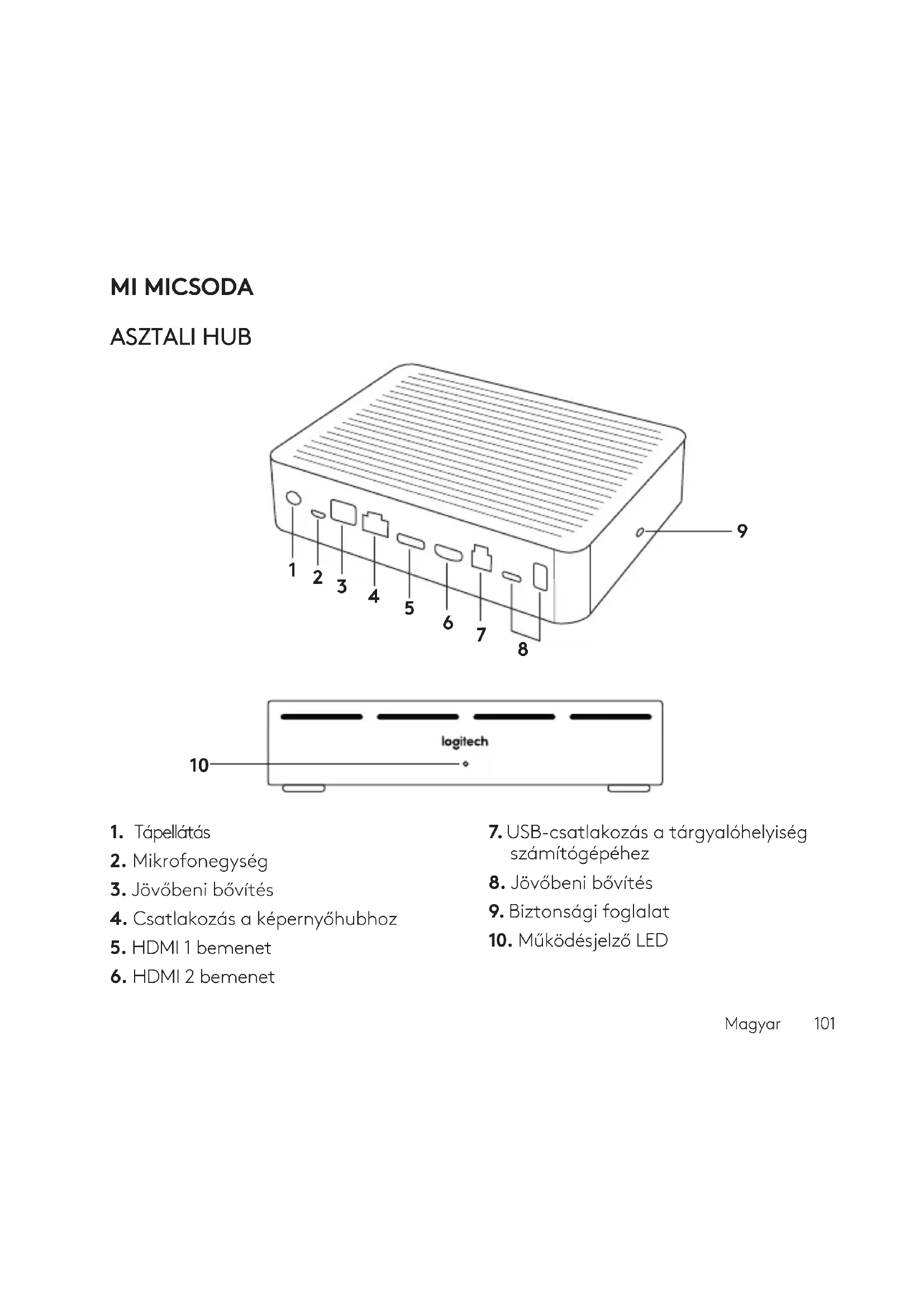 ALKALMAZÁS Ezt a programot a kamera pásztázás, döntés, nagyítás, fókusz és képminőség (pl. fényerő, kontraszt) funkcióinak számítógépről történő vezérlésére használhatja. A szoftver a www.logitech.com/support/Rally weboldalról tölthető le.Magyar 107 A RALLY FUNKCIÓBŐVÍTÉSE Több opcionális kiegészítő is rendelkezésre áll, hogy megkönnyítse a telepítést és lehetővé tegye a RALLY PLUS nagyobb helyiségekben történő használatát: