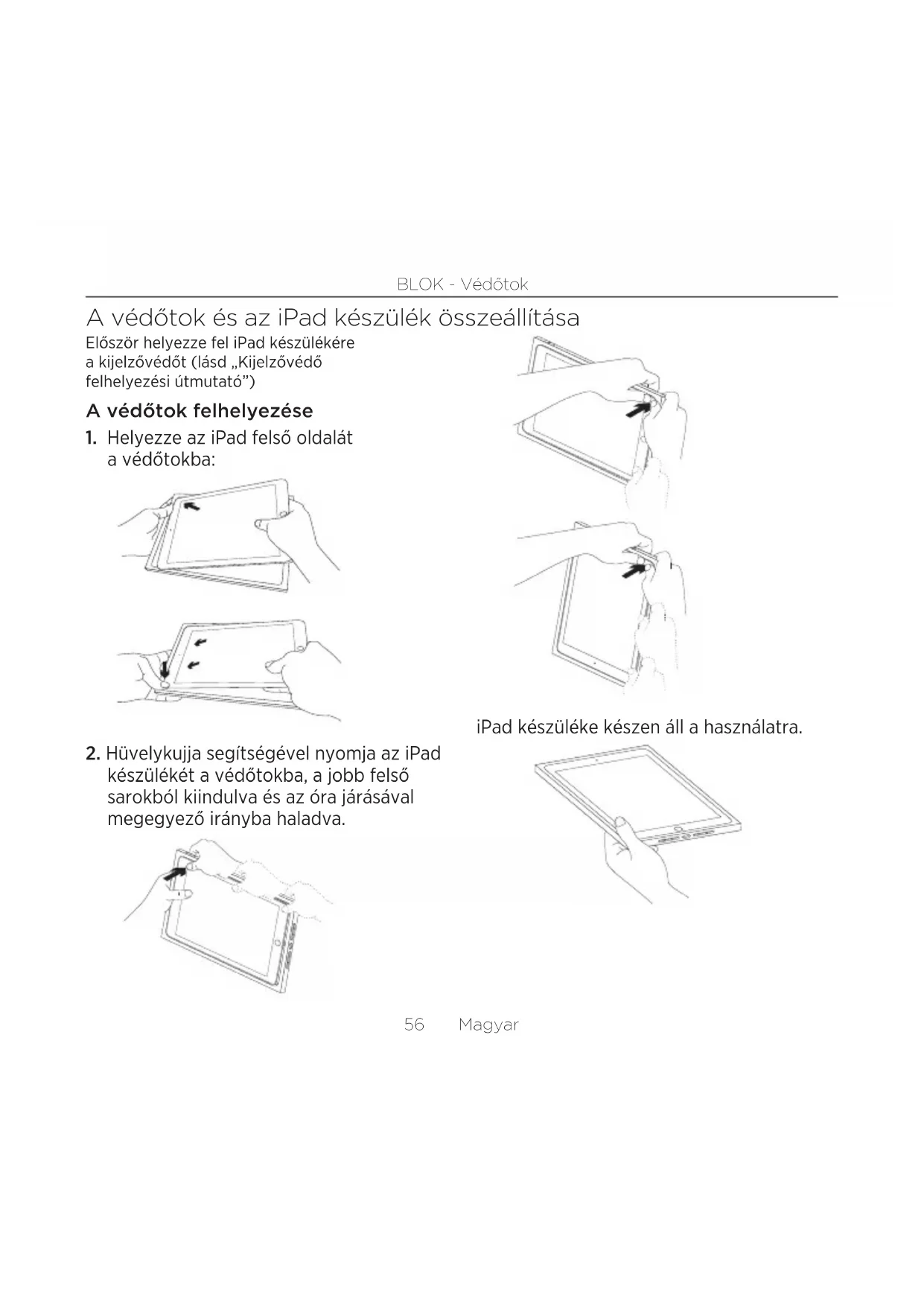 BLOK - Védőtok A védőtok és az iPad készülék összeállítása Először helyezze fel iPad készülékére a kijelzővédőt (lásd „Kijelzővédő felhelyezési útmutató”) A védőtok felhelyezése