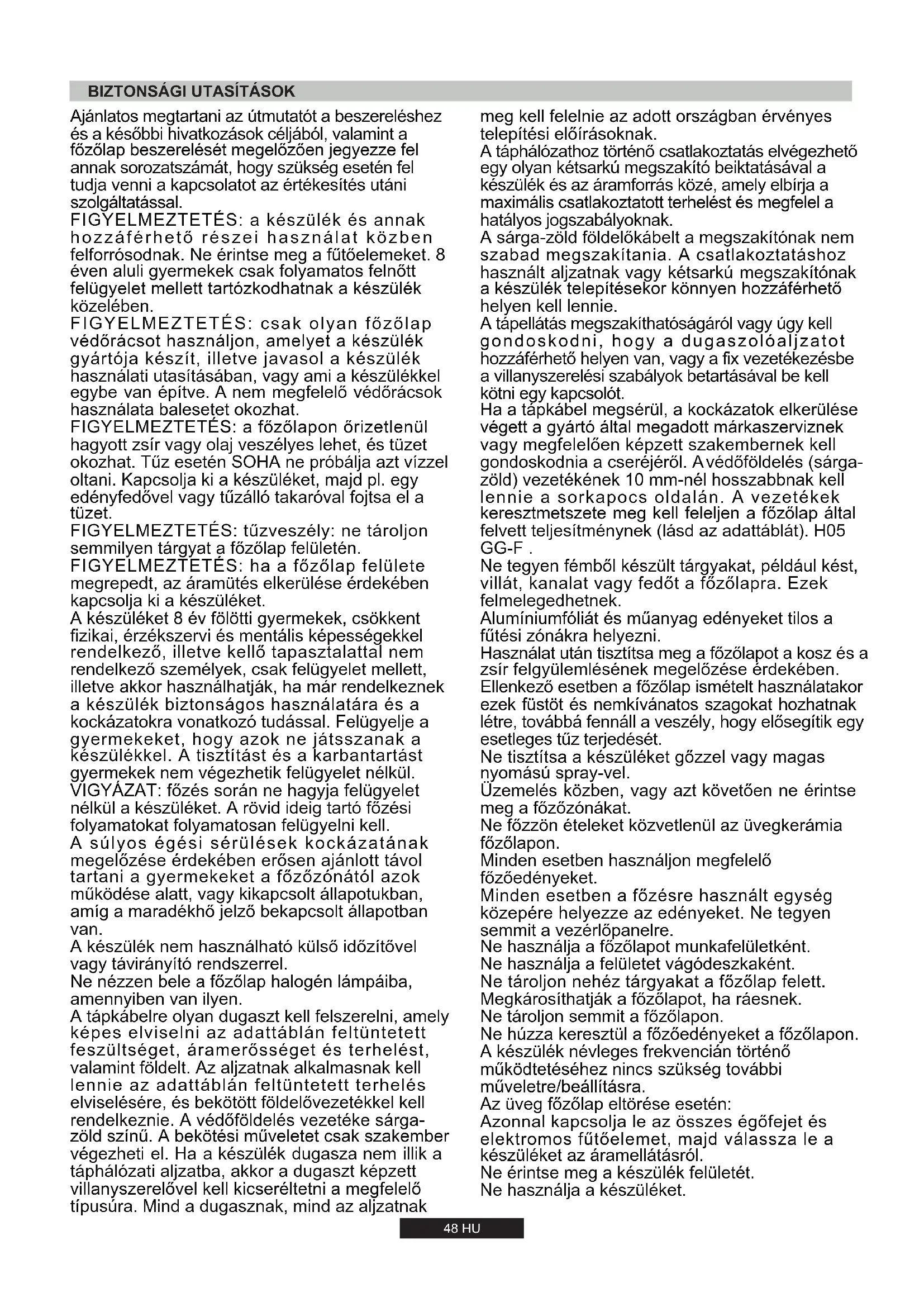 VIGYÁZAT: főzés során ne hagyja felügyelet nélkül a készüléket. A rövid ideig tartó főzési folyamatokat folyamatosan felügyelni kell. FIGYELMEZTETÉS: tűzveszély: ne tároljon semmilyen tárgyat a főzőlap felületén. Ajánlatos megtartani az útmutatót a beszereléshez és a későbbi hivatkozások céljából, valamint a főzőlap beszerelését megelőzően jegyezze fel annak sorozatszámát, hogy szükség esetén fel tudja venni a kapcsolatot az értékesítés utáni szolgáltatással. FIGYELMEZTETÉS: a készülék és annak hozzáférhető részei használat közben felforrósodnak. Ne érintse meg a fűtőelemeket. 8 éven aluli gyermekek csak folyamatos felnőtt felügyelet mellett tartózkodhatnak a készülék közelében. FIGYELMEZTETÉS: a főzőlapon őrizetlenül hagyott zsír vagy olaj veszélyes lehet, és tüzet okozhat. Tűz esetén SOHA ne próbálja azt vízzel oltani. Kapcsolja ki a készüléket, majd pl. egy edényfedővel vagy tűzálló takaróval fojtsa el a tüzet. A készüléket 8 év fölötti gyermekek, csökkent fizikai, érzékszervi és mentális képességekkel rendelkező, illetve kellő tapasztalattal nem rendelkező személyek, csak felügyelet mellett, illetve akkor használhatják, ha már rendelkeznek a készülék biztonságos használatára és a kockázatokra vonatkozó tudással. Felügyelje a gyermekeket, hogy azok ne játsszanak a készülékkel. A tisztítást és a karbantartást gyermekek nem végezhetik felügyelet nélkül. Ne nézzen bele a főzőlap halogén lámpáiba, amennyiben van ilyen. FIGYELMEZTETÉS: csak olyan főzőlap védőrácsot használjon, amelyet a készülék gyártója készít, illetve javasol a készülék használati utasításában, vagy ami a készülékkel egybe van építve. A nem megfelelő védőrácsok használata balesetet okozhat. FIGYELMEZTETÉS: ha a főzőlap felülete megrepedt, az áramütés elkerülése érdekében kapcsolja ki a készüléket. A tápkábelre olyan dugaszt kell felszerelni, amely képes elviselni az adattáblán feltüntetett feszültséget, áramerősséget és terhelést, valamint földelt. Az aljzatnak alkalmasnak kell lennie az adattáblán feltüntetett terhelés elviselésére, és bekötött földelővezetékkel kell rendelkeznie. A védőföldelés vezetéke sárga- zöld színű. A bekötési műveletet csak szakember végezheti el. Ha a készülék dugasza nem illik a táphálózati aljzatba, akkor a dugaszt képzett villanyszerelővel kell kicseréltetni a megfelelő típusúra. Mind a dugasznak, mind az aljzatnak A készülék nem használható külső időzítővel vagy távirányító rendszerrel. A súlyos égési sérülések kockázatának megelőzése érdekében erősen ajánlott távol tartani a gyermekeket a főzőzónától azok működése alatt, vagy kikapcsolt állapotukban, amíg a maradékhő jelző bekapcsolt állapotban van.