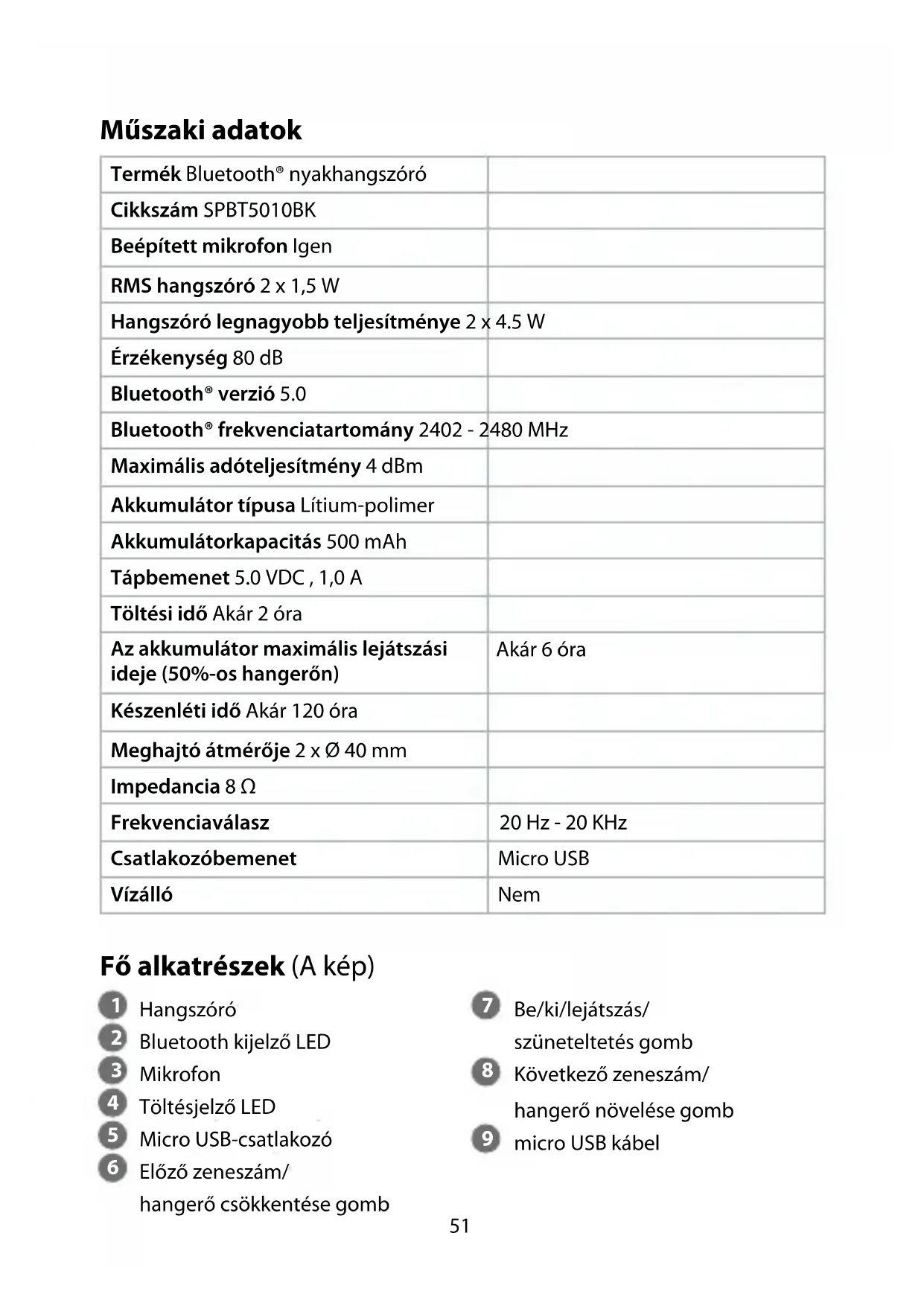 Találja meg az eszköz kézikönyvét ingyenesen SPBT5010BK NEDIS PDF formátumban.