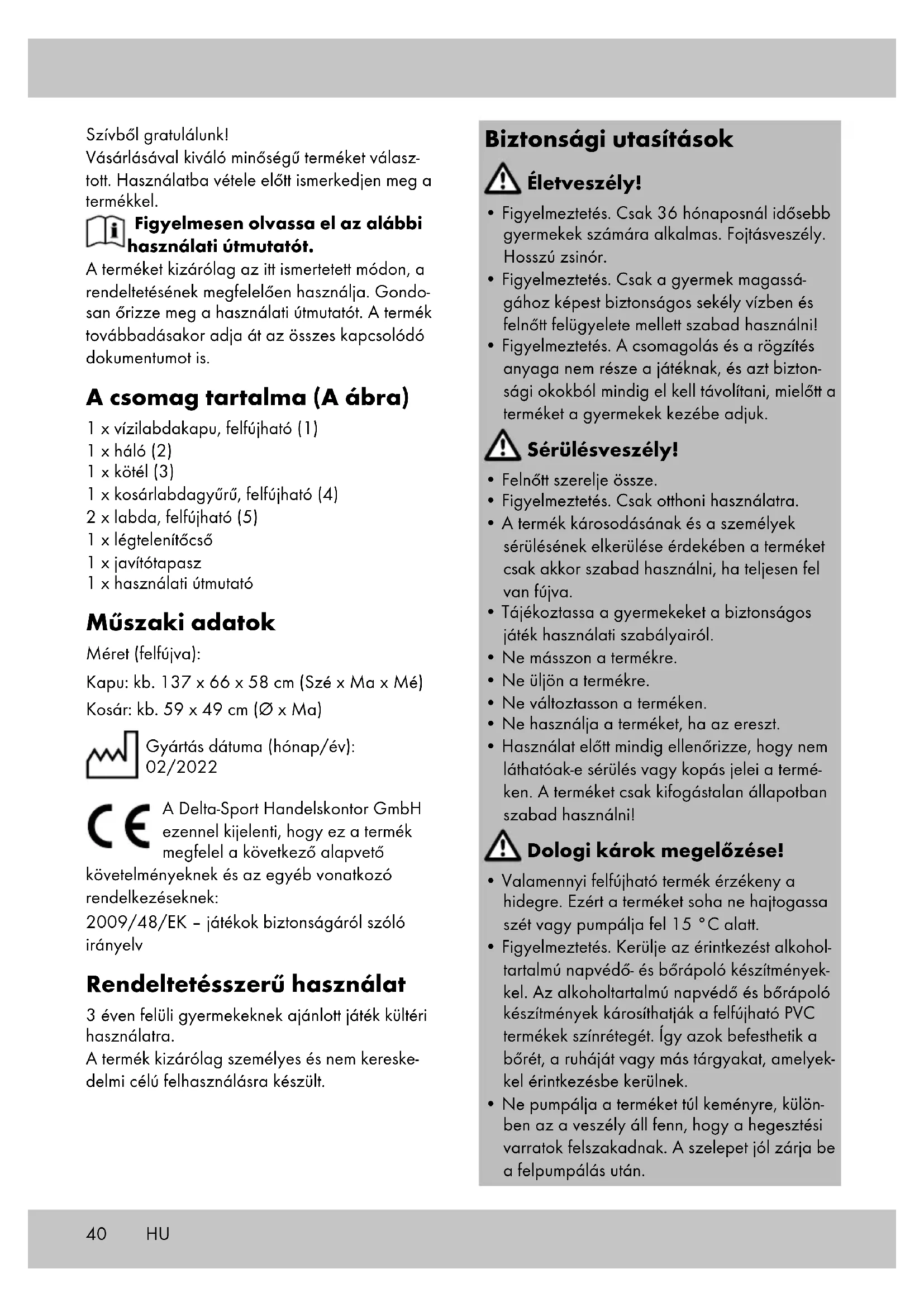fel a sérült területre, majd erősen nyomja oda. Tárolás, tisztítás Ha nem használja a terméket, mindig száraz, tiszta és leengedett állapotban, szobahőmérsék- leten tárolja. A szelepet tárolás közben mindig zárva kell tartani. Ne rakjon éles tárgyat a téli tároláskor a termékre, és ne szórja be talkummal. Csak nedves törlőkendővel tisztítsa meg, utána törölje szárazra. FONTOS! Ne használjon éles tisztítószereket a tisztításhoz. Tudnivalók a hulladékkeze- lésről Az árucikket és a csomagolóanyagot az érvé- nyes helyi előírásoknak megfelelően ártalmatla- nítsa. A csomagolóanyagok, pl. nylonzacskók, nem kerülhetnek gyermekek kezébe. A csoma- golóanyagot gyermekek számára hozzá nem férhető helyen tárolja. A terméket és csomagolását környezet- barát módon selejtezze le. Az újrahasznosító kód a különböző anyagokat jelöli, hogy azok nyersanyag- ként újrahasznosíthatók legyenek. A kód az újrahasznosítás jelből - értsd: az újra- hasznosítás körforgás jelölése - és egy számból áll, ami adott anyagot jelöl. A garanciával és a szerviz lebonyolításával kapcsolatos útmutató A termék nagy gondossággal és állandó ellenőr- zés mellett készült. A DELTA-SPORT HANDELS- KONTOR GmbH privát végső felhasználóknak a vásárlás dátumától számított három év (garancia időtartama) garanciát ad erre a termékre a kö- vetkező rendelkezések szerint. A garancia csak anyaghibára és feldolgozási hibára érvényes. A garancia nem terjed ki a szokásos elhasználó- dásnak kitett, ezért kopó alkatrésznek tekintendő alkatrészekre (pl. elemek), valamint a törékeny alkatrészekre sem, például a kapcsolókra, az akkumulátorokra vagy az üvegből készült alkatrészekre. Kizárásra kerül a garanciaigény, ha a terméket szakszerűtlenül vagy helytelenül, nem rendel- tetésszerűen vagy nem az előirányzott felhasz- nálási körben használták, vagy figyelmen kívül hagyták a kezelési útmutató előírásait, kivéve, ha a végső felhasználó bizonyítja, hogy olyan anyag- vagy feldolgozási hiba áll fenn, amely nem a fent említett körülmények valamelyikéből ered. A garanciaigény csak a garancia időtartamán belül, az eredeti pénztári bizonylat bemutatásá- val érvényesíthető. Ezért kérjük, őrizze meg az eredeti pénztári bizonylatot. A garancia, a tör- vényes garancia vagy a méltányosság alapján végzett esetleges javítások a garancia időtar- tamát nem hosszabbítják meg. Ez vonatkozik a kicserélt és javított alkatrészekre is. Kérjük, hogy reklamáció esetén először az aláb- bi szervizvonalat hívja, vagy e-mailen keressen minket. Garanciális esetekben a terméket saját döntésünk alapján ingyenesen megjavítjuk, kicseréljük vagy megtérítjük a vételárat. A garan- ciából további jogok nem következnek. A jelen garancia nem korlátozza az Ön törvé- nyes jogait, különösen a mindenkori értékesítővel szembeni garanciaigényét. IAN: 388686_2107 Szerviz Magyarország Tel.: 06800 21225 E-Mail: deltasport@lidl.hu HU43 Čestitamo! Z nakupom ste se odločili za viso- kokakovosten izdelek. Pred prvo uporabo se seznanite z izdelkom. V ta namen natančno preberite naslednje navodilo za uporabo. Izdelek uporabljajte, kot je opisano, in za navedena področja uporabe. To navodilo za uporabo skrbno hranite. Če boste izdelek predali tretjim osebam, zraven priložite vso dokumentacijo. Obseg dobave (sl. A) 1 x gol za vaterpolo, napihljiv (1) 1 x mreža (2) 1 x vrv (3) 1 x košarkarski obroč, napihljiv (4) 2 x žoga, napihljiva (5) 1 x cevka za odzračevanje 1 x zaplata za popravilo 1 x navodilo za uporabo Tehnični podatki Mere (napolnjen z zrakom): Gol: pribl. 137 x 66 x 58 cm (Š x V x G) Koš: pribl. 59 x 49 cm (Ø x V) Datum izdelave (mesec/leto): 02/2022 Delta-Sport Handelskontor GmbH izjavlja, da ta izdelek izpolnjuje naslednje osnovne zahteve in druga ustrezna določila: 2009/48/ES – Direktiva o igračah Namenska uporaba Ta izdelek je igrača za otroke od 3. leta dalje za uporabo na prostem. Izdelek je namenjen le za zasebno in ne za komercialno rabo. Varnostni napotki Smrtna nevarnost!