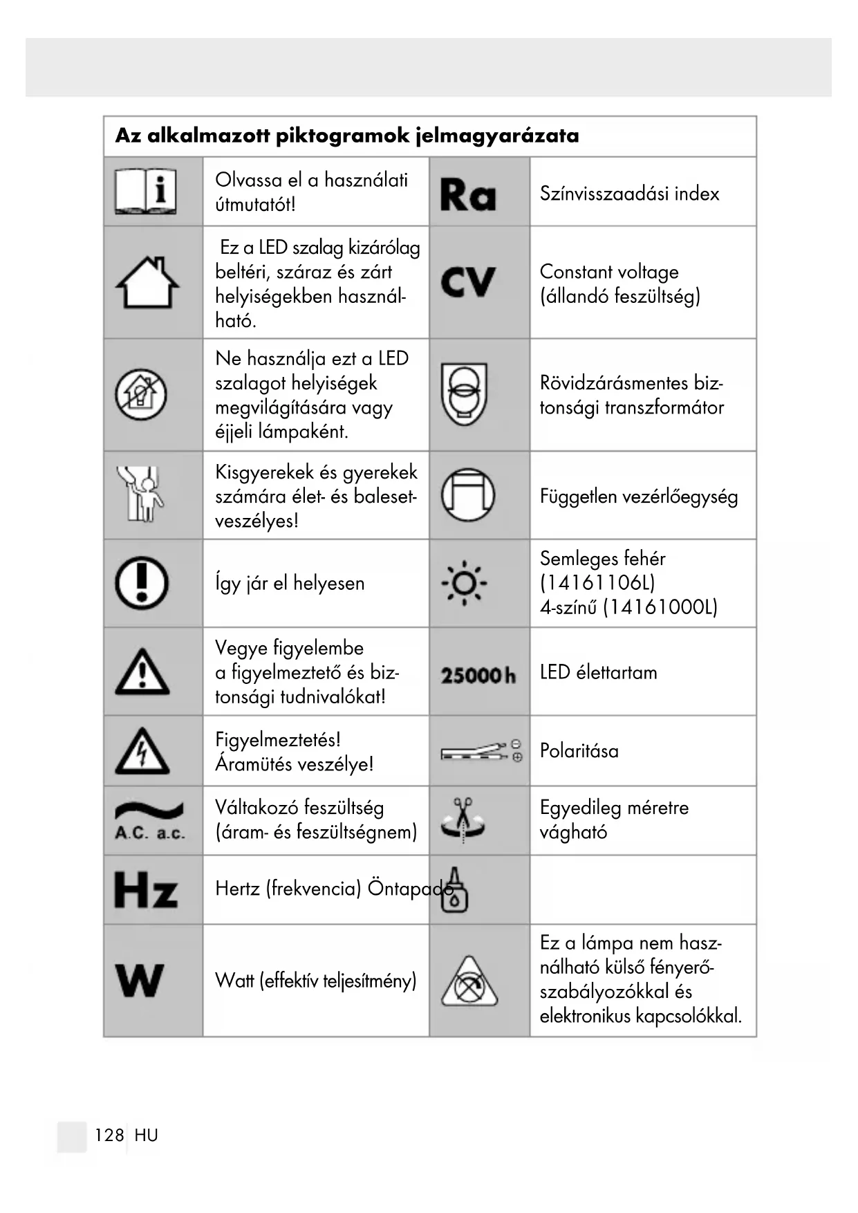 Fényhőmérséklet Kelvinben Egyenáram (áram- és feszültségnem) A csomagolás 100% újrahasznosított papír- ból készült. Biztonsági törpefeszültség A csomagolást és az eszközt környezetbarát módon ártalmatlanítsa! Milliamper Polietilén (alacsony sűrűségű) Ez a lámpa „IP20” védettségi fokozattal rendelkezik, és kizárólag beltéren, magánháztar- tásokban történő fel- használásra készült. Más műanyagok mint polikarbonát (PC), poliamid (PA), akril- nitril-butadién-sztirol (ABS), polimetil-metakrilát (PMMA), polilaktidok (PLA) stb. Környezeti hőmérséklet Hullámkarton Burkolat hőmérséklete a megadott ponton130 HU LED fényszalag, 3 m Bevezető Kérjük, olvassa el gondosan és végig ezt a kezelési útmutatót. Ez az útmutató ehhez a termékhez tartozik és fontos tudnivalókat tartalmaz az üzembevétellel és a kezeléssel kapcsolatban. Mindig tartsa szem előtt a biztonsági utasításokat. Az üzembevétel előtt vizsgálja meg, hogy a megfelelő feszültség rendelkezésre áll-e és hogy mindegyik rész helyesen van-e összeszerelve. Amennyiben a készülék kezelésével kapcsolatos kérdései lennének, vegye fel a kapcsolatot a kereskedőjével vagy a szervizzel. Őrizze meg jól ezt az utasítást és adott esetben adja tovább a harmadik félnek. Rendeltetésszerű használat Ez a LED szalag kizárólag beltéri, száraz és zárt helyiségekben használható. A készülék csak magánháztartásokban történő alkal- mazásra és nem közületi használatra készült. Az előbb leírtaktól eltérő alkalmazás nem megengedett és károsodásokhoz vezet. Ezen túlmenően veszélyhelyzetet, mint pl. rövidzárlatot, tüzet, áramütést, stb. okozhat. A jelen termék normál üzemeltetésre van tervezve. Csak a 14161000L: Ez a termék egy fénydekoráció. Ne használja ezt a LED szalagot helyiségek megvilágítására vagy éjjeli lámpaként. A csomag tartalma Közvetlenül a kicsomagolás után vizsgálja meg a csomag teljességét, valamint a készülék kifogástalan állapotát. 1 LED fényszalag 2 összekötő 4 zárósapka 2 kábeltartó 1 ragasztószalag 1 használati útmutató131 HU Alkatrészleírás