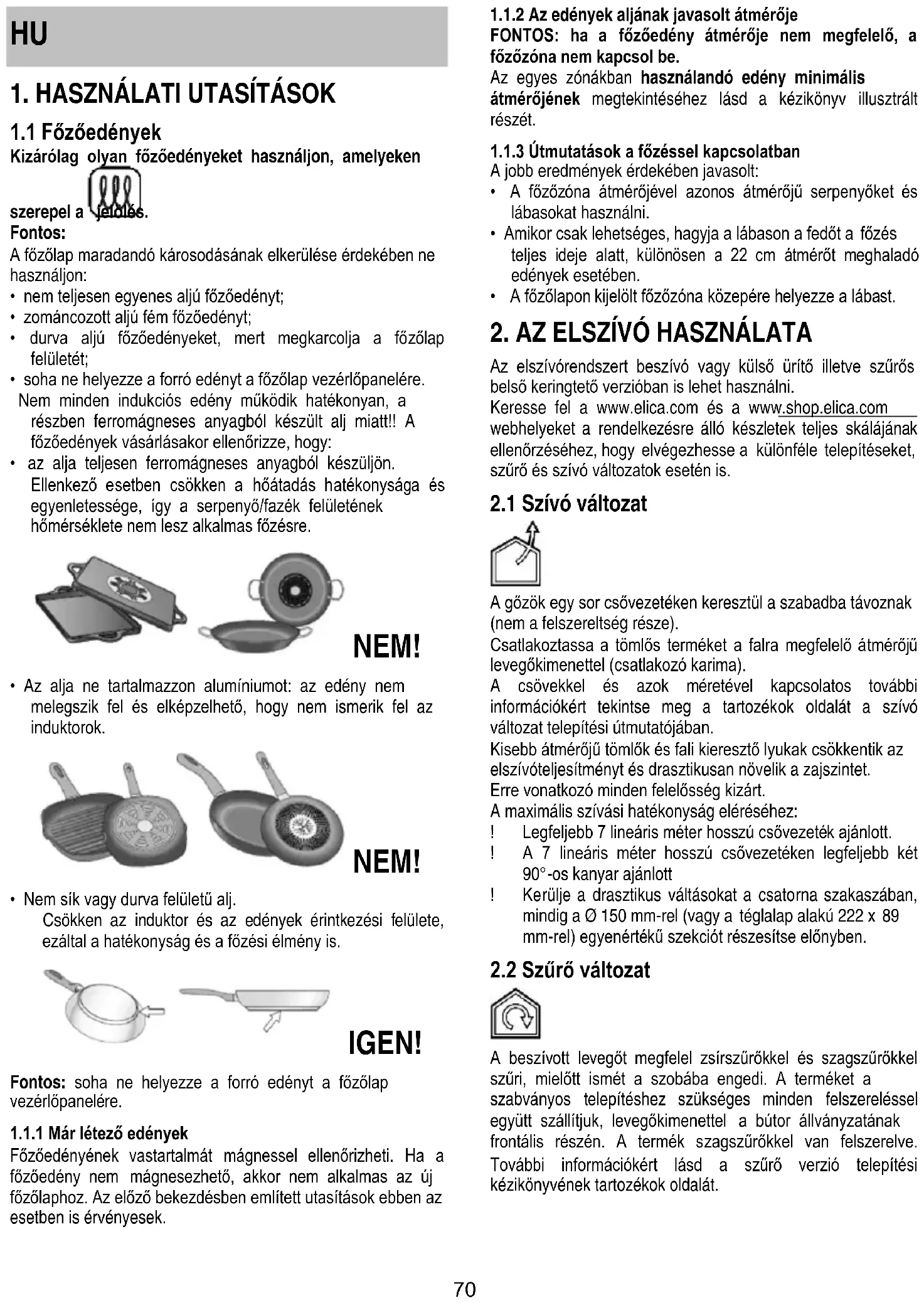 Az elszívórendszert beszívó vagy külső ürítő illetve szűrős belső keringtető verzióban is lehet használni. Keresse fel a www.elica.com és a www.shop.elica.com webhelyeket a rendelkezésre álló készletek teljes skálájának ellenőrzéséhez, hogy elvégezhesse a különféle telepítéseket, szűrő és szívó változatok esetén is.