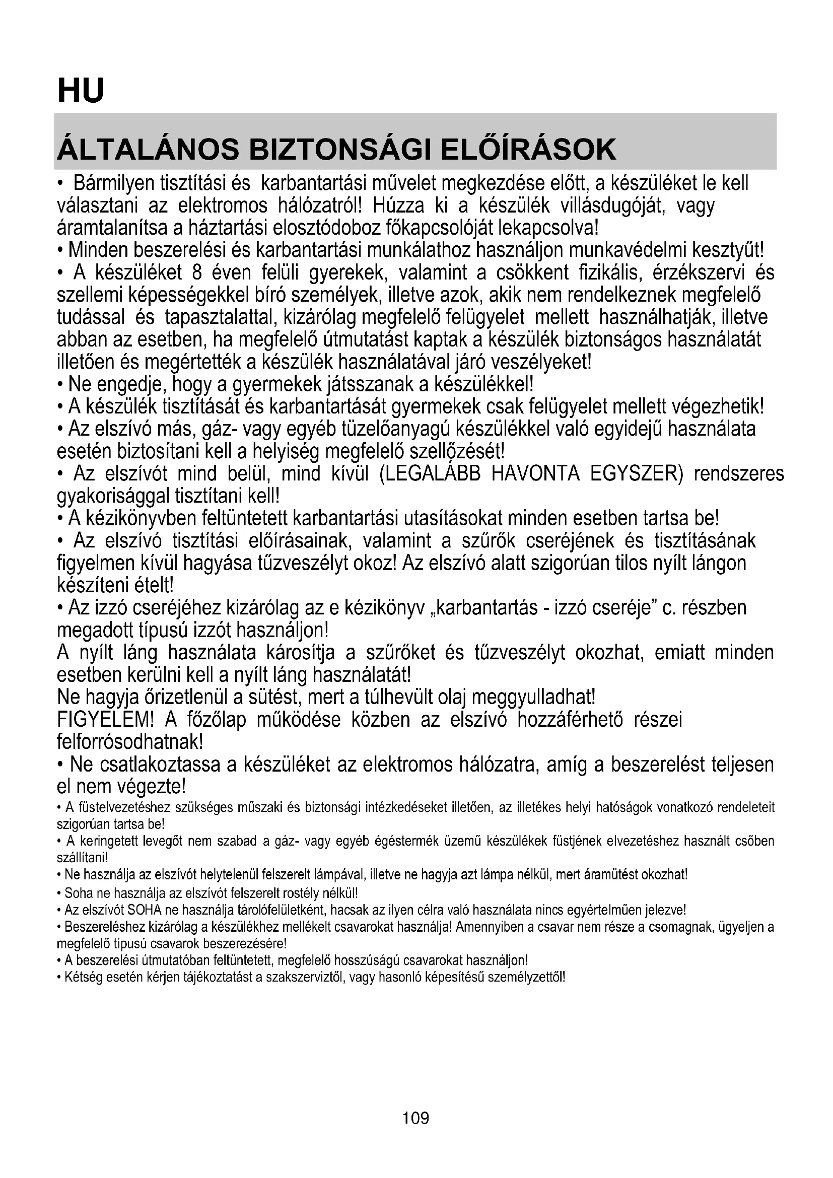 - Az elszívót mind belül, mind kívül (LEGALÁBB HAVONTA EGYSZER) rendszeres gyakorisággal tisztítani kell!