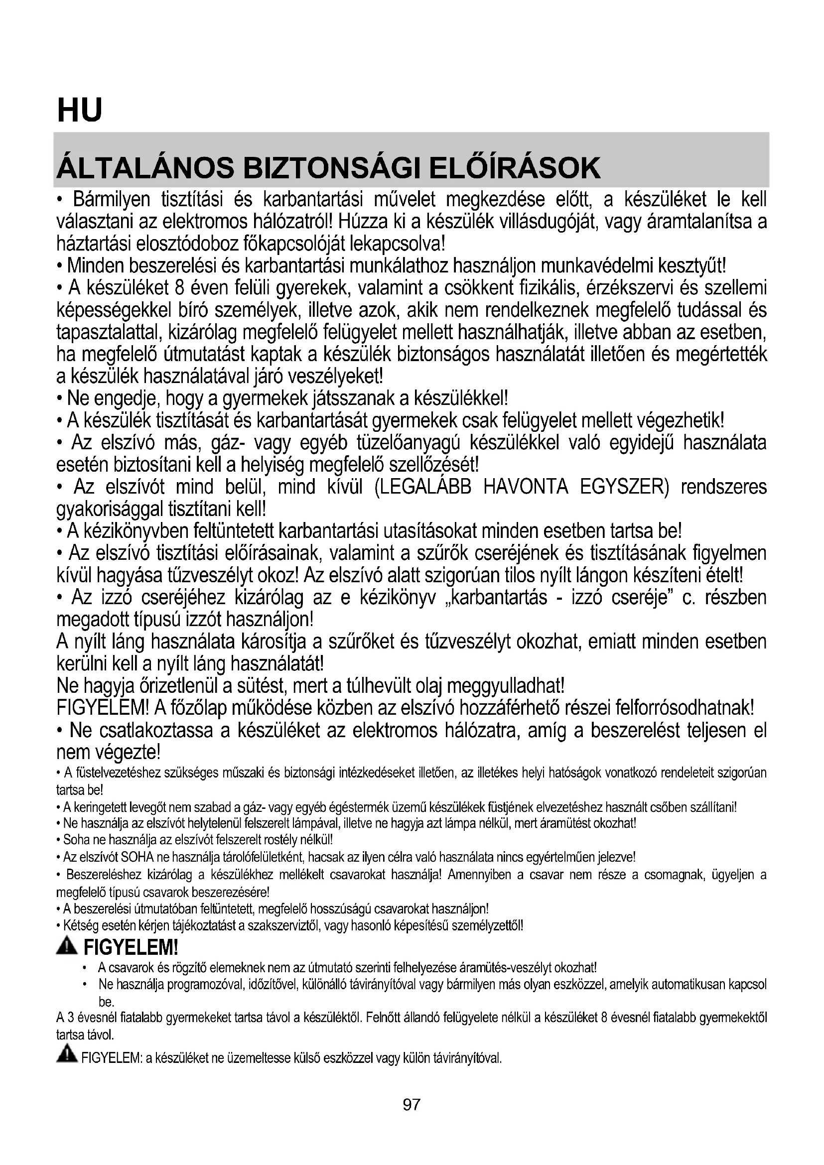 - Az elszívó tisztítási előírásainak, valamint a szűrők cseréjének és tisztításának figyelmen kívül hagyása tűzveszélyt okoz! Az elszívó alatt szigorúan tilos nyílt lángon készíteni ételt!