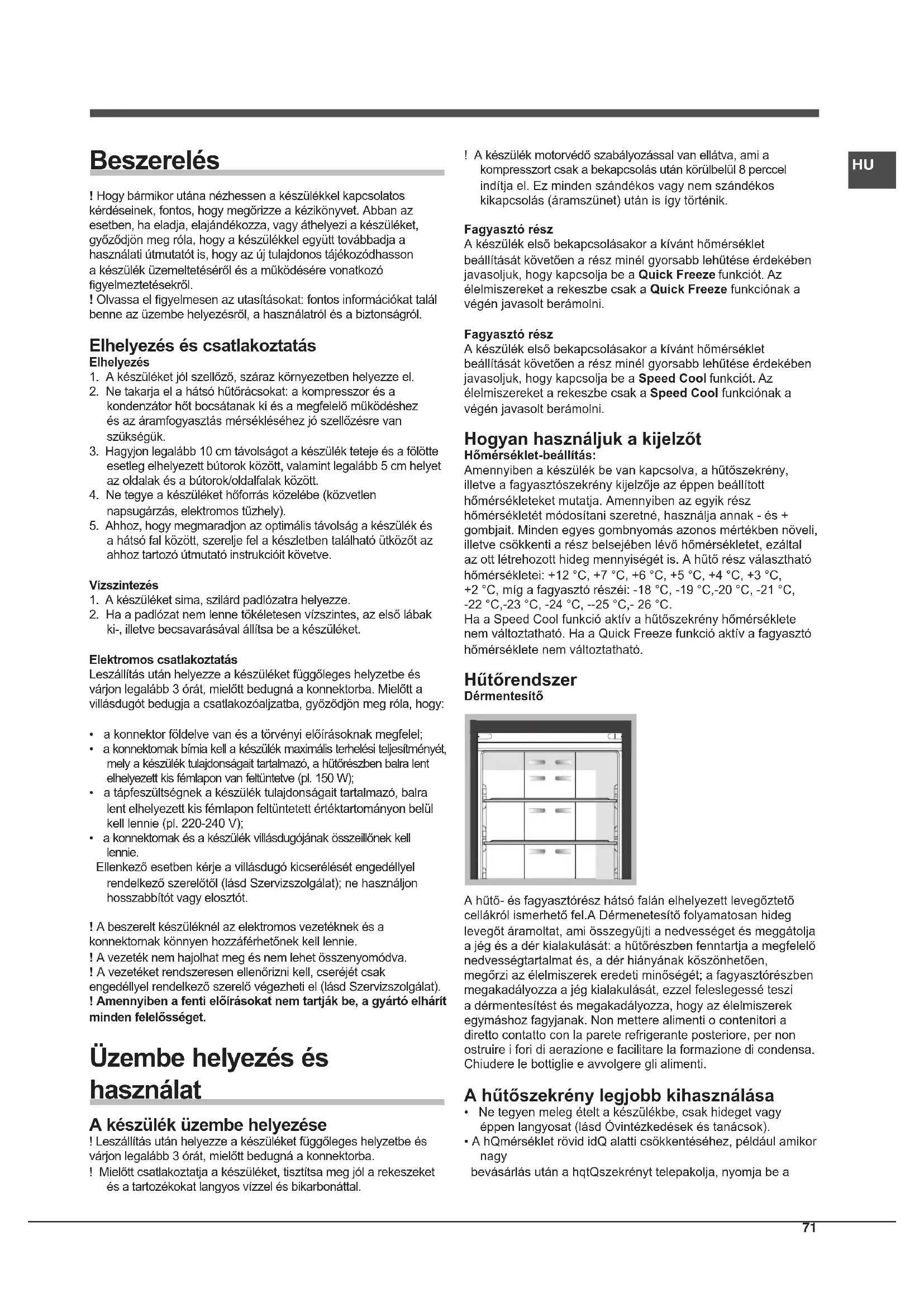 - a konnektornak és a készülék villásdugójának összeillőnek kell lennie. Ellenkező esetben kérje a villásdugó kicserélését engedéllyel rendelkező szerelőtől (lásd Szervizszolgálat); ne használjon hosszabbítót vagy elosztót. ! A beszerelt készüléknél az elektromos vezetéknek és a konnektornak könnyen hozzáférhetőnek kell lennie. ! A vezeték nem hajolhat meg és nem lehet összenyomódva. ! A vezetéket rendszeresen ellenőrizni kell, cseréjét csak engedéllyel rendelkező szerelő végezheti el (lásd Szervizszolgálat). ! Amennyiben a fenti előírásokat nem tartják be, a gyártó elhárít minden felelősséget. Üzembe helyezés és használat A készülék üzembe helyezése ! Leszállítás után helyezze a készüléket függőleges helyzetbe és várjon legalább 3 órát, mielőtt bedugná a konnektorba. ! Mielőtt csatlakoztatja a készüléket, tisztítsa meg jól a rekeszeket és a tartozékokat langyos vízzel és bikarbonáttal. ! A készülék motorvédő szabályozással van ellátva, ami a kompresszort csak a bekapcsolás után körülbelül 8 perccel indítja el. Ez minden szándékos vagy nem szándékos kikapcsolás (áramszünet) után is így történik. Fagyasztó rész A készülék első bekapcsolásakor a kívánt hőmérséklet beállítását követően a rész minél gyorsabb lehűtése érdekében javasoljuk, hogy kapcsolja be a Quick Freeze funkciót. Az élelmiszereket a rekeszbe csak a Quick Freeze funkciónak a végén javasolt berámolni. Fagyasztó rész A készülék első bekapcsolásakor a kívánt hőmérséklet beállítását követően a rész minél gyorsabb lehűtése érdekében javasoljuk, hogy kapcsolja be a Speed Cool funkciót. Az élelmiszereket a rekeszbe csak a Speed Cool funkciónak a végén javasolt berámolni. Hogyan használjuk a kijelzőt Hőmérséklet-beállítás: Amennyiben a készülék be van kapcsolva, a hűtőszekrény, illetve a fagyasztószekrény kijelzője az éppen beállított hőmérsékleteket mutatja. Amennyiben az egyik rész hőmérsékletét módosítani szeretné, használja annak - és + gombjait. Minden egyes gombnyomás azonos mértékben növeli, illetve csökkenti a rész belsejében lévő hőmérsékletet, ezáltal az ott létrehozott hideg mennyiségét is. A hűtő rész választható hőmérsékletei: +12 °C, +7 °C, +6 °C, +5 °C, +4 °C, +3 °C, +2 °C, míg a fagyasztó részéi: -18 °C, -19 °C,-20 °C, -21 °C, -22 °C,-23 °C, -24 °C, --25 °C,- 26 °C. Ha a Speed Cool funkció aktív a hűtőszekrény hőmérséklete nem változtatható. Ha a Quick Freeze funkció aktív a fagyasztó hőmérséklete nem változtatható. Hűtőrendszer Dérmentesítő A hűtő- és fagyasztórész hátsó falán elhelyezett levegőztető cellákról ismerhető fel.A Dérmenetesítő folyamatosan hideg levegőt áramoltat, ami összegyűjti a nedvességet és meggátolja a jég és a dér kialakulását: a hűtőrészben fenntartja a megfelelő nedvességtartalmat és, a dér hiányának köszönhetően, megőrzi az élelmiszerek eredeti minőségét; a fagyasztórészben megakadályozza a jég kialakulását, ezzel feleslegessé teszi a dérmentesítést és megakadályozza, hogy az élelmiszerek egymáshoz fagyjanak. Non mettere alimenti o contenitori a diretto contatto con la parete refrigerante posteriore, per non ostruire i fori di aerazione e facilitare la formazione di condensa. Chiudere le bottiglie e avvolgere gli alimenti. A hűtőszekrény legjobb kihasználása