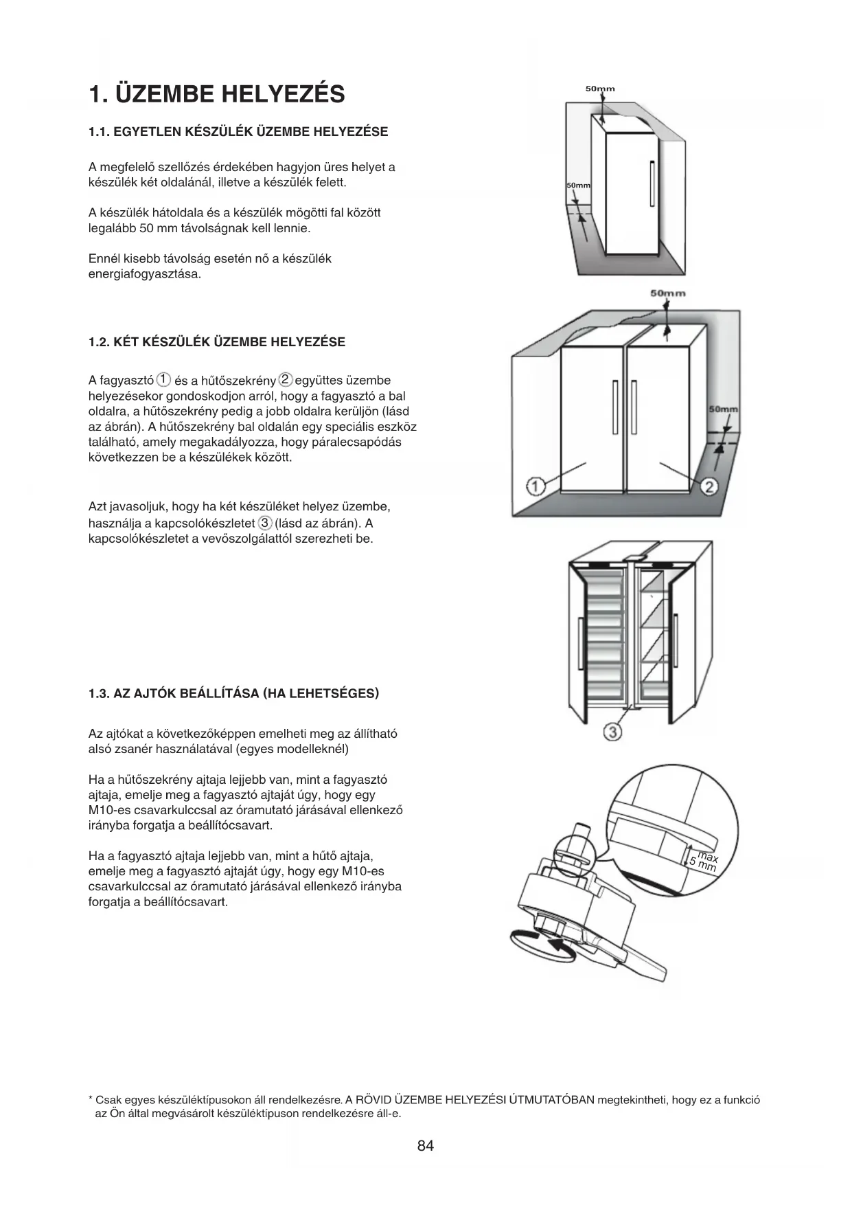 1.1. EGYETLEN KÉSZÜLÉK ÜZEMBE HELYEZÉSE Amegfelelőszellőzésérdekébenhagyjonüreshelyeta készülékkétoldalánál,illetveakészülékfelett. Akészülékhátoldalaésakészülékmögöttifalközött legalább50mmtávolságnakkelllennie. Ennélkisebbtávolságeseténnőakészülék energiafogyasztása. 1.2. KÉT KÉSZÜLÉK ÜZEMBE HELYEZÉSE A fagyasztó