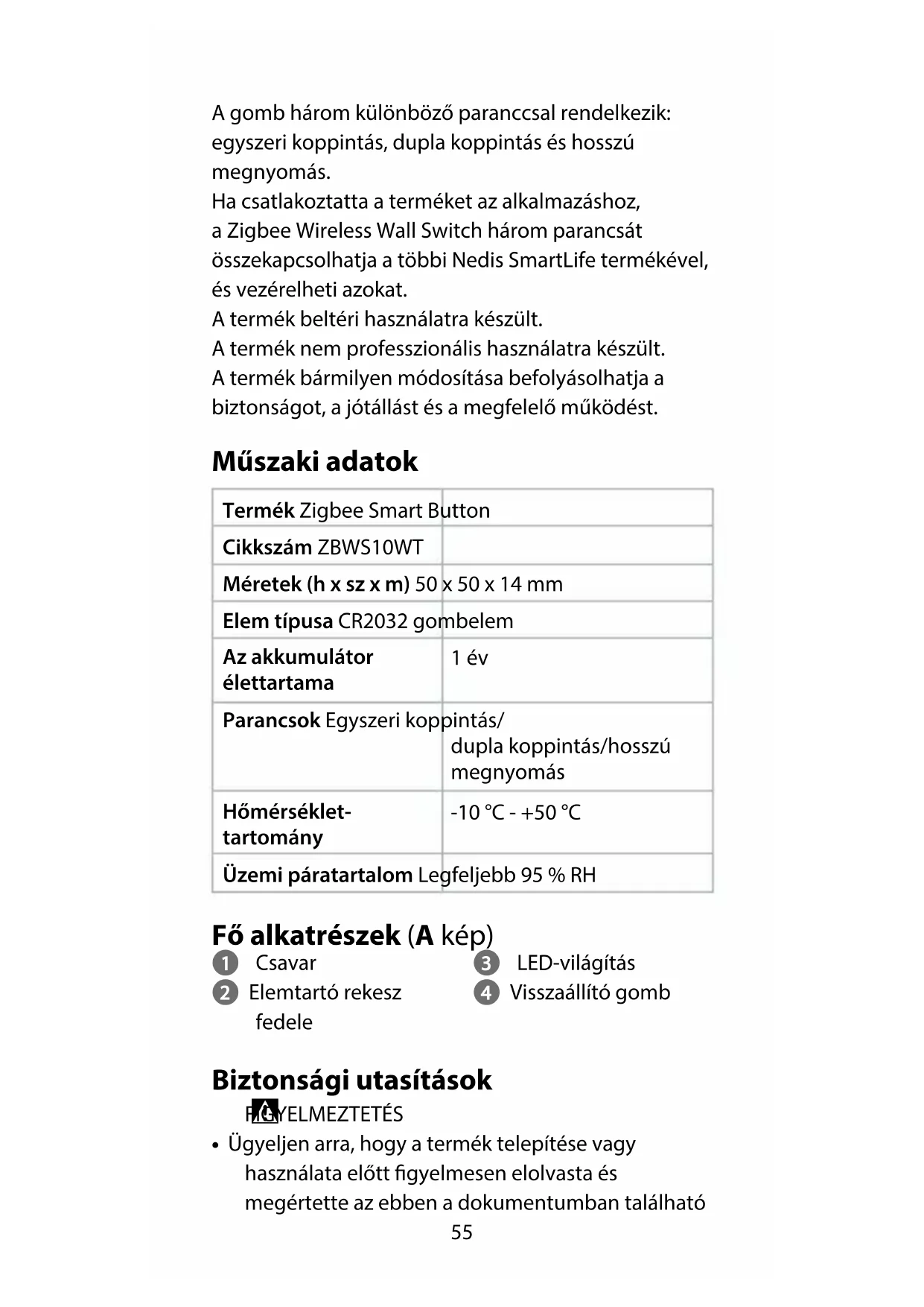 Gyors beüzemelési útmutató Zigbee Smart Button ZBWS10WT Tervezett felhasználás A Nedis ZBWS10WT egy vezeték nélküli, akkumulátorral működő intelligens gomb. Ezzel a gombbal a Nedis SmartLife termékcsalád összekapcsolt termékeit vezérelheti. A termék vezeték nélkül csatlakoztatható a Nedis SmartLife alkalmazáshoz a Zigbee átjárón keresztül.55