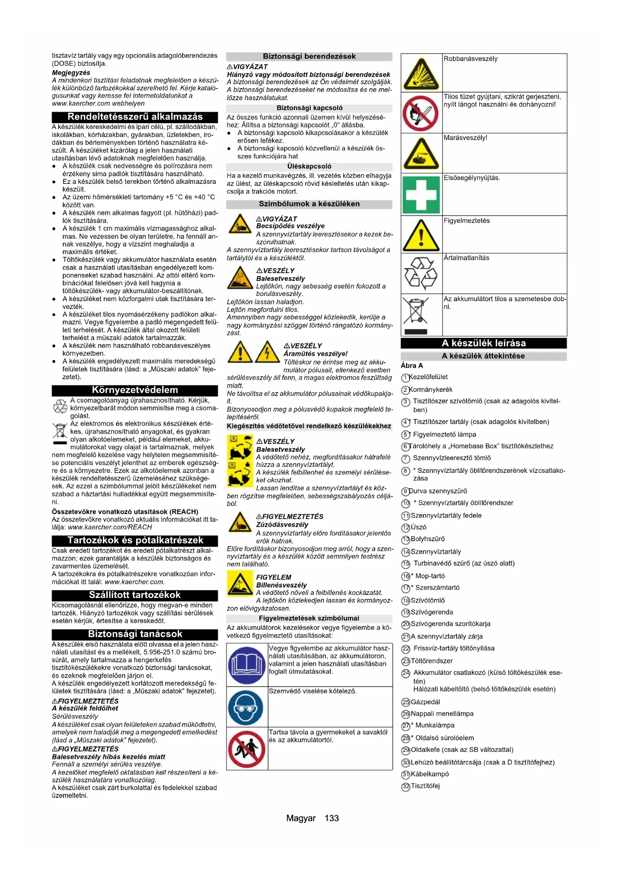 - EU-megfelelőségi nyilatkozat Magyar 133 tisztavíz tartály vagy egy opcionális adagolóberendezés (DOSE) biztosítja. Megjegyzés A mindenkori tisztítási feladatnak megfelelően a készü- lék különböző tartozékokkal szerelhető fel. Kérje kataló- gusunkat vagy keresse fel internetoldalunkat a www.kaercher.com webhelyen Rendeltetésszerű alkalmazás A készülék kereskedelmi és ipari célú, pl. szállodákban, iskolákban, kórházakban, gyárakban, üzletekben, iro- dákban és bérleményekben történő használatra ké- szült. A készüléket kizárólag a jelen használati utasításban lévő adatoknak megfelelően használja. ● A készülék csak nedvességre és polírozásra nem érzékeny sima padlók tisztítására használható. ● Ez a készülék belső terekben történő alkalmazásra készült. ● Az üzemi hőmérsékleti tartomány +5 °C és +40 °C között van. ● A készülék nem alkalmas fagyott (pl. hűtőházi) pad- lók tisztítására. ● A készülék 1 cm maximális vízmagassághoz alkal- mas. Ne vezessen be olyan területre, ha fennáll an- nak veszélye, hogy a vízszint meghaladja a maximális értéket. ● Töltőkészülék vagy akkumulátor használata esetén csak a használati utasításban engedélyezett kom- ponenseket szabad használni. Az attól eltérő kom- binációkat felelősen jóvá kell hagynia a töltőkészülék- vagy akkumulátor-beszállítónak. ● A készüléket nem közforgalmi utak tisztítására ter- vezték. ● A készüléket tilos nyomásérzékeny padlókon alkal- mazni. Vegye figyelembe a padló megengedett felü- leti terhelését. A készülék által okozott felületi terhelést a műszaki adatok tartalmazzák. ● A készülék nem használható robbanásveszélyes környezetben. ● A készülék engedélyezett maximális meredekségű felületek tisztítására (lásd: a „Műszaki adatok” feje- zetet). Környezetvédelem A csomagolóanyag újrahasznosítható. Kérjük, környezetbarát módon semmisítse meg a csoma- golást. Az elektromos és elektronikus készülékek érté- kes, újrahasznosítható anyagokat, és gyakran olyan alkotóelemeket, például elemeket, akku- mulátorokat vagy olajat is tartalmaznak, melyek nem megfelelő kezelése vagy helytelen megsemmisíté- se potenciális veszélyt jelenthet az emberek egészség- re és a környezetre. Ezek az alkotóelemek azonban a készülék rendeltetésszerű üzemeléséhez szüksége- sek. Az ezzel a szimbólummal jelölt készülékeket nem szabad a háztartási hulladékkal együtt megsemmisíte- ni. Összetevőkre vonatkozó utasítások (REACH) Az összetevőkre vonatkozó aktuális információkat itt ta- lálja: www.kaercher.com/REACH Tartozékok és pótalkatrészek Csak eredeti tartozékot és eredeti pótalkatrészt alkal- mazzon; ezek garantálják a készülék biztonságos és zavarmentes üzemelését. A tartozékokra és pótalkatrészekre vonatkozóan infor- mációkat itt talál: www.kaercher.com. Szállított tartozékok Kicsomagolásnál ellenőrizze, hogy megvan-e minden tartozék. Hiányzó tartozékok vagy szállítási sérülések esetén kérjük, értesítse a kereskedőt. Biztonsági tanácsok A készülék első használata előtt olvassa el a jelen hasz- nálati utasítást és a mellékelt, 5.956-251.0 számú bro- súrát, amely tartalmazza a hengerkefés tisztítókészülékekre vonatkozó biztonsági tanácsokat, és ezeknek megfelelően járjon el. A készülék engedélyezett korlátozott meredekségű fe- lületek tisztítására (lásd: a „Műszaki adatok” fejezetet). 몇 FIGYELMEZTETÉS A készülék feldőlhet Sérülésveszély A készüléket csak olyan felületeken szabad működtetni, amelyek nem haladják meg a megengedett emelkedést (lásd a „Műszaki adatok” fejezetet). 몇 FIGYELMEZTETÉS Balesetveszély hibás kezelés miatt Fennáll a személyi sérülés veszélye. A kezelőket megfelelő oktatásban kell részesíteni a ké- szülék használatára vonatkozólag. A készüléket csak zárt burkolattal és fedelekkel szabad üzemeltetni. Biztonsági berendezések 몇 VIGYÁZAT Hiányzó vagy módosított biztonsági berendezések A biztonsági berendezések az Ön védelmét szolgálják. A biztonsági berendezéseket ne módosítsa és ne mel- lőzze használatukat. Biztonsági kapcsoló Az összes funkció azonnali üzemen kívül helyezésé- hez: Állítsa a biztonsági kapcsolót „0” állásba. ● A biztonsági kapcsoló kikapcsolásakor a készülék erősen lefékez. ● A biztonsági kapcsoló közvetlenül a készülék ös- szes funkciójára hat Üléskapcsoló Ha a kezelő munkavégzés, ill. vezetés közben elhagyja az ülést, az üléskapcsoló rövid késleltetés után kikap- csolja a trakciós motort. Szimbólumok a készüléken 몇VIGYÁZAT Becsípődés veszélye A szennyvíztartály leeresztésekor a kezek be- szorulhatnak. A szennyvíztartály leeresztésekor tartson távolságot a tartálytól és a készüléktől. VESZÉLY Balesetveszély Lejtőkön, nagy sebesség esetén fokozott a borulásveszély. Lejtőkön lassan haladjon. Lejtőn megfordulni tilos. Amennyiben nagy sebességgel közlekedik, kerülje a nagy kormányzási szöggel történő rángatózó kormány- zást. VESZÉLY Áramütés veszélye! Töltéskor ne érintse meg az akku- mulátor pólusait, ellenkező esetben sérülésveszély áll fenn, a magas elektromos feszültség miatt. Ne távolítsa el az akkumulátor pólusainak védőkupakja- it. Bizonyosodjon meg a pólusvédő kupakok megfelelő te- lepítéséről. Kiegészítés védőtetővel rendelkező készülékekhez VESZÉLY Balesetveszély A védőtető nehéz, megfordításakor hátrafelé húzza a szennyvíztartályt. A készülék felbillenhet és személyi sérülése- ket okozhat. Lassan lendítse a szennyvíztartályt és köz- ben rögzítse megfelelően, sebességszabályozás céljá- ból. 