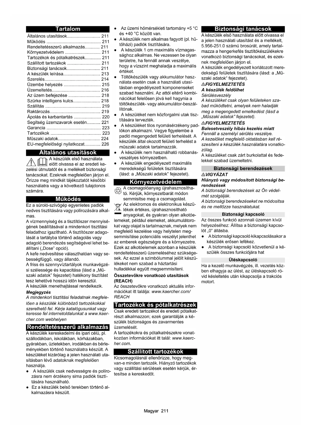 - - - 30,6 (30) 30,6 (30) B 110 R 65 B 110 D 65 B 110 R 75 B 110 D 75Magyar 211 Tartalom Általános utasítások A készülék első használata előtt olvassa el az eredeti ke- zelési útmutatót és a mellékelt biztonsági tanácsokat. Ezeknek megfelelően járjon el. Őrizze meg mindkét tájékoztatót későbbi használatra vagy a következő tulajdonos számára. Működés Ez a súroló-szívógép egyenletes padlók nedves tisztítására vagy polírozására alkal- mas. A vízmennyiség és a tisztítószer mennyisé- gének beállításával a mindenkori tisztítási feladathoz igazítható. A tisztítószer adago- lását a tartályba történő adagolás vagy adagoló berendezés segítségével lehet be- állítani („Dose” opció). A kefe nedvesítése választhatóan vagy se- bességfüggő, vagy állandó. A friss és szennyvíztartályok munkavégzé- si szélessége és kapacitása (lásd a „Mű- szaki adatok” fejezetet) hatékony tisztítást tesz lehetővé hosszú időn keresztül. A készülék menethajtással rendelkezik. Megjegyzés A mindenkori tisztítási feladatnak megfele- lően a készülék különböző tartozékokkal szerelhető fel. Kérje katalógusunkat vagy keresse fel internetoldalunkat a www.kaer- cher.com webhelyen Rendeltetésszerű alkalmazás A készülék kereskedelmi és ipari célú, pl. szállodákban, iskolákban, kórházakban, gyárakban, üzletekben, irodákban és bérle- ményekben történő használatra készült. A készüléket kizárólag a jelen használati uta- sításban lévő adatoknak megfelelően használja. ● A készülék csak nedvességre és políro- zásra nem érzékeny sima padlók tisztí- tására használható. ● Ez a készülék belső terekben történő al- kalmazásra készült. ● Az üzemi hőmérsékleti tartomány +5 °C és +40 °C között van. ● A készülék nem alkalmas fagyott (pl. hű- tőházi) padlók tisztítására. ● A készülék 1 cm maximális vízmagas- sághoz alkalmas. Ne vezessen be olyan területre, ha fennáll annak veszélye, hogy a vízszint meghaladja a maximális értéket. ● Töltőkészülék vagy akkumulátor hasz- nálata esetén csak a használati utasí- tásban engedélyezett komponenseket szabad használni. Az attól eltérő kombi- nációkat felelősen jóvá kell hagynia a töltőkészülék- vagy akkumulátor-beszál- lítónak. ● A készüléket nem közforgalmi utak tisz- títására tervezték. ● A készüléket tilos nyomásérzékeny pad- lókon alkalmazni. Vegye figyelembe a padló megengedett felületi terhelését. A készülék által okozott felületi terhelést a műszaki adatok tartalmazzák. ● A készülék nem használható robbanás- veszélyes környezetben. ● A készülék engedélyezett maximális meredekségű felületek tisztítására (lásd: a „Műszaki adatok” fejezetet). Környezetvédelem A csomagolóanyag újrahasznosítha- tó. Kérjük, környezetbarát módon semmisítse meg a csomagolást. Az elektromos és elektronikus készü- lékek értékes, újrahasznosítható anyagokat, és gyakran olyan alkotóe- lemeket, például elemeket, akkumulátoro- kat vagy olajat is tartalmaznak, melyek nem megfelelő kezelése vagy helytelen meg- semmisítése potenciális veszélyt jelenthet az emberek egészségre és a környezetre. Ezek az alkotóelemek azonban a készülék rendeltetésszerű üzemeléséhez szüksége- sek. Az ezzel a szimbólummal jelölt készü- lékeket nem szabad a háztartási hulladékkal együtt megsemmisíteni. Összetevőkre vonatkozó utasítások (REACH) Az összetevőkre vonatkozó aktuális infor- mációkat itt találja: www.kaercher.com/ REACH Tartozékok és pótalkatrészek Csak eredeti tartozékot és eredeti pótalkat- részt alkalmazzon; ezek garantálják a ké- szülék biztonságos és zavarmentes üzemelését. A tartozékokra és pótalkatrészekre vonat- kozóan információkat itt talál: www.kaerc- her.com. Szállított tartozékok Kicsomagolásnál ellenőrizze, hogy meg- van-e minden tartozék. Hiányzó tartozékok vagy szállítási sérülések esetén kérjük, ér- tesítse a kereskedőt. Biztonsági tanácsok A készülék első használata előtt olvassa el a jelen használati utasítást és a mellékelt, 5.956-251.0 számú brosúrát, amely tartal- mazza a hengerkefés tisztítókészülékekre vonatkozó biztonsági tanácsokat, és ezek- nek megfelelően járjon el. A készülék engedélyezett korlátozott mere- dekségű felületek tisztítására (lásd: a „Mű- szaki adatok” fejezetet). 몇 FIGYELMEZTETÉS A készülék feldőlhet Sérülésveszély A készüléket csak olyan felületeken sza- bad működtetni, amelyek nem haladják meg a megengedett emelkedést (lásd a „Műszaki adatok” fejezetet). 몇 FIGYELMEZTETÉS Balesetveszély hibás kezelés miatt Fennáll a személyi sérülés veszélye. A kezelőket megfelelő oktatásban kell ré- szesíteni a készülék használatára vonatko- zólag. A készüléket csak zárt burkolattal és fede- lekkel szabad üzemeltetni. Biztonsági berendezések 몇 VIGYÁZAT Hiányzó vagy módosított biztonsági be- rendezések A biztonsági berendezések az Ön védel- mét szolgálják. A biztonsági berendezéseket ne módosítsa és ne mellőzze használatukat. Biztonsági kapcsoló Az összes funkció azonnali üzemen kívül helyezéséhez: Állítsa a biztonsági kapcso- lót „0” állásba. ● A biztonsági kapcsoló kikapcsolásakor a készülék erősen lefékez. ● A biztonsági kapcsoló közvetlenül a ké- szülék összes funkciójára hat Üléskapcsoló Ha a kezelő munkavégzés, ill. vezetés köz- ben elhagyja az ülést, az üléskapcsoló rö- vid késleltetés után kikapcsolja a trakciós motort. Általános utasítások p. 211