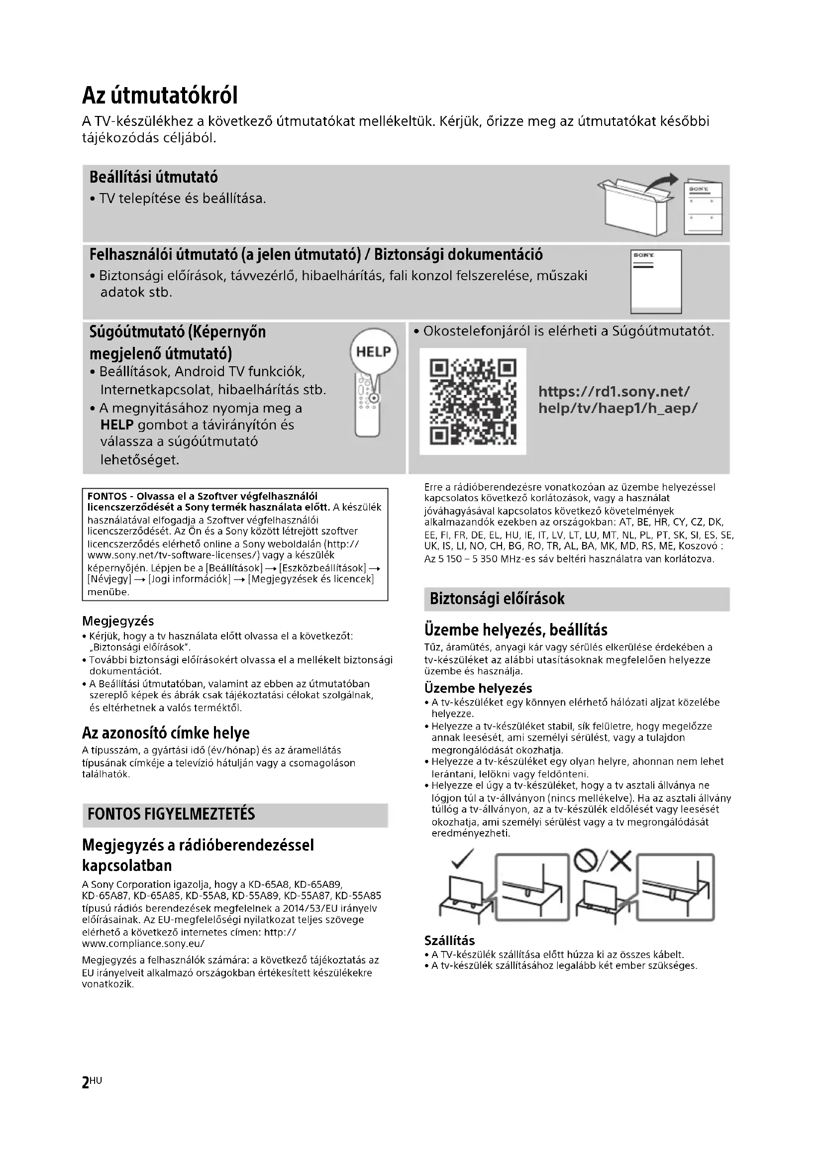 A Sony Corporation igazolja, hogy a KD-65A8, KD-65A89, KD-65A87, KD-65A85, KD-55A8, KD-55A89, KD-55A87, KD-55A85 tipusu radios berendezesek megelelnek a 2014/53/EU iranyel elorsinak. Az EU-megelelosegi nyilatkozat teljes szovege elerhetto a kovetkez o internets cimen: http:// www.compliance.sony.eu/